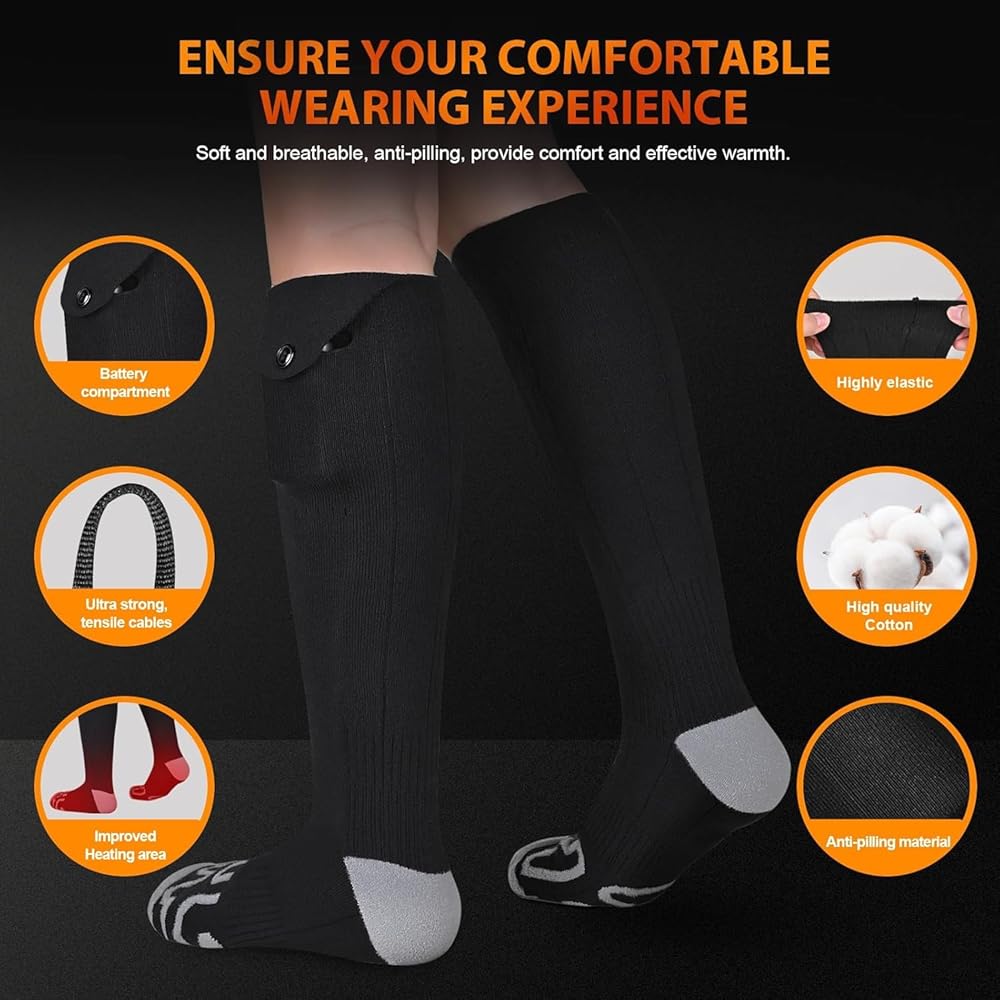 【Comfortable and Durable】Our heated socks are crafted from high-quality cotton and modal materials, suitable for sizes 6-14 USA. They provide exceptional comfort, breathability, and prevent moisture buildup and odors, keeping your feet fresh and comfortable. Additionally, there is faux fur-like padding at the toe and heel areas, enhancing insulation and ensuring durability.