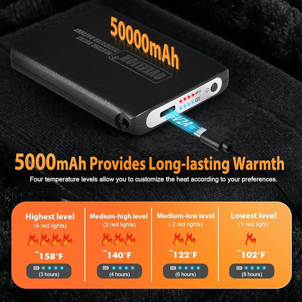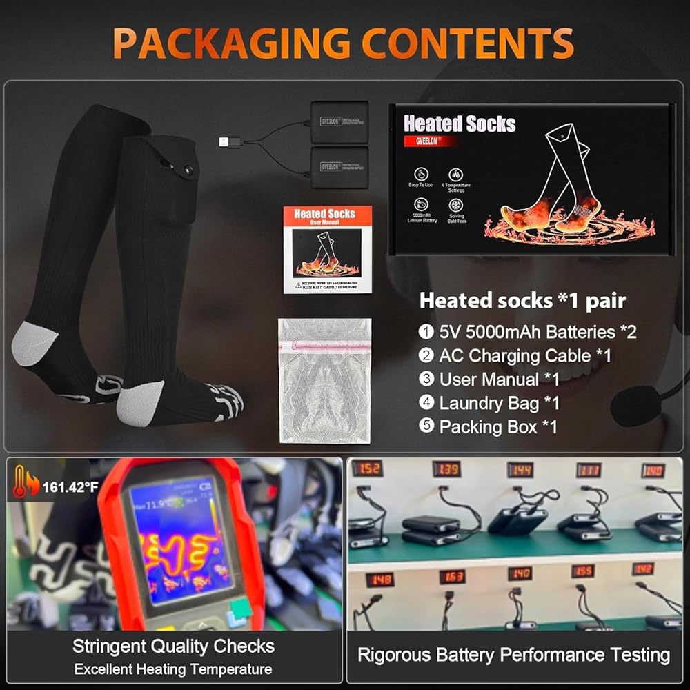 【Perfect Temperature】Electric Socks by GVEELION come with a high-capacity 5V 5000mAh battery, delivering outstanding battery life and temperature control – high level (158°F, 3 hours), medium level (140°F, 4 hours), low level (122°F, 6 hours), and the lowest setting (102°F, 8 hours). Regardless of the situation, our electric heated socks can offer a tailored comfort, ensuring customers enjoy warmth for longer during outdoor activities.