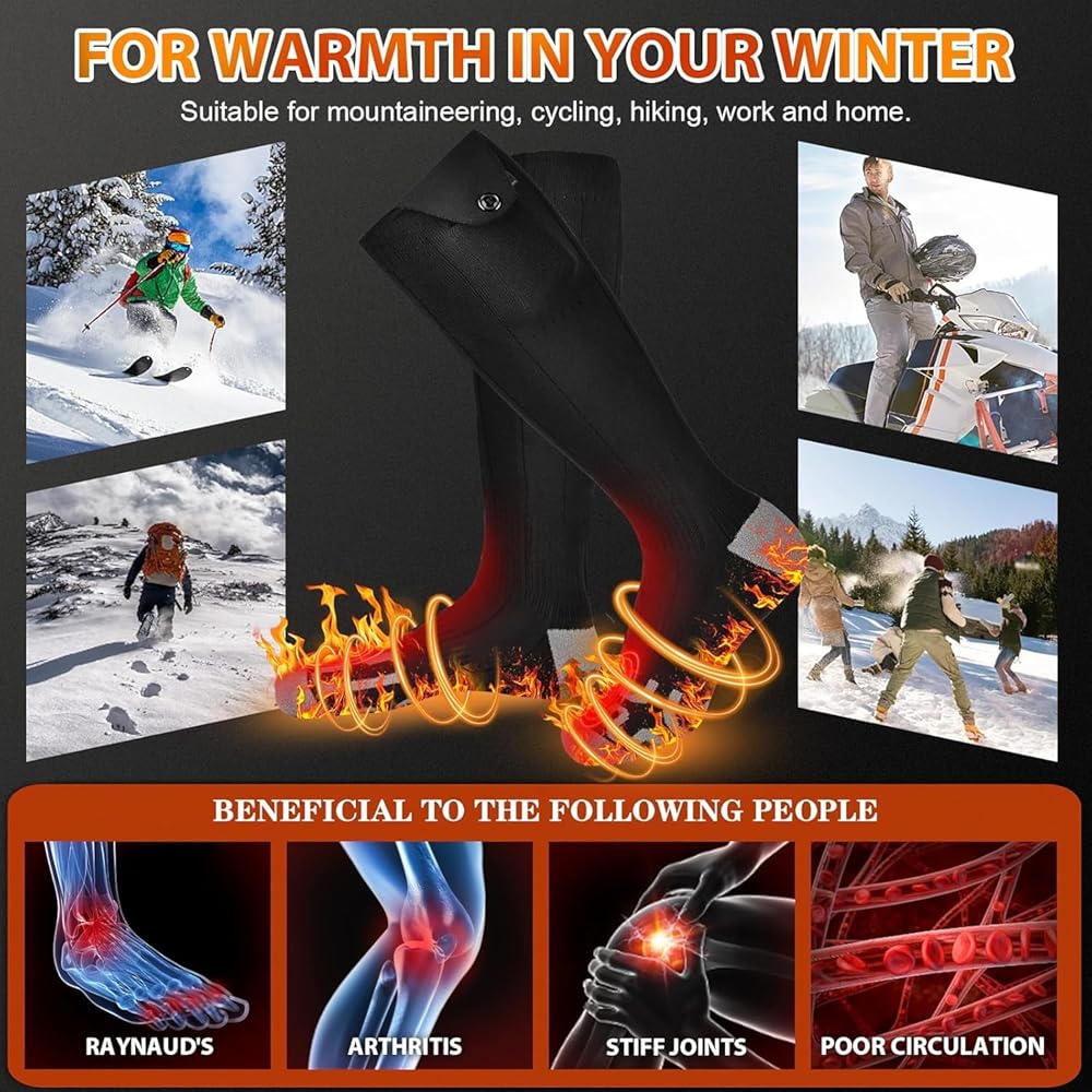 【A Fantastic Gift】GVEELION Heated Socks are perfect for activities like skiing, snowboarding, hiking, or even hunting in cold weather. They are also a great fit for individuals dealing with Raynaud's syndrome, ankle arthritis, chronic cold, and joint stiffness. These best heated socks make lovely and practical gifts for family and friends, keeping them warm and comfortable during winter activities.