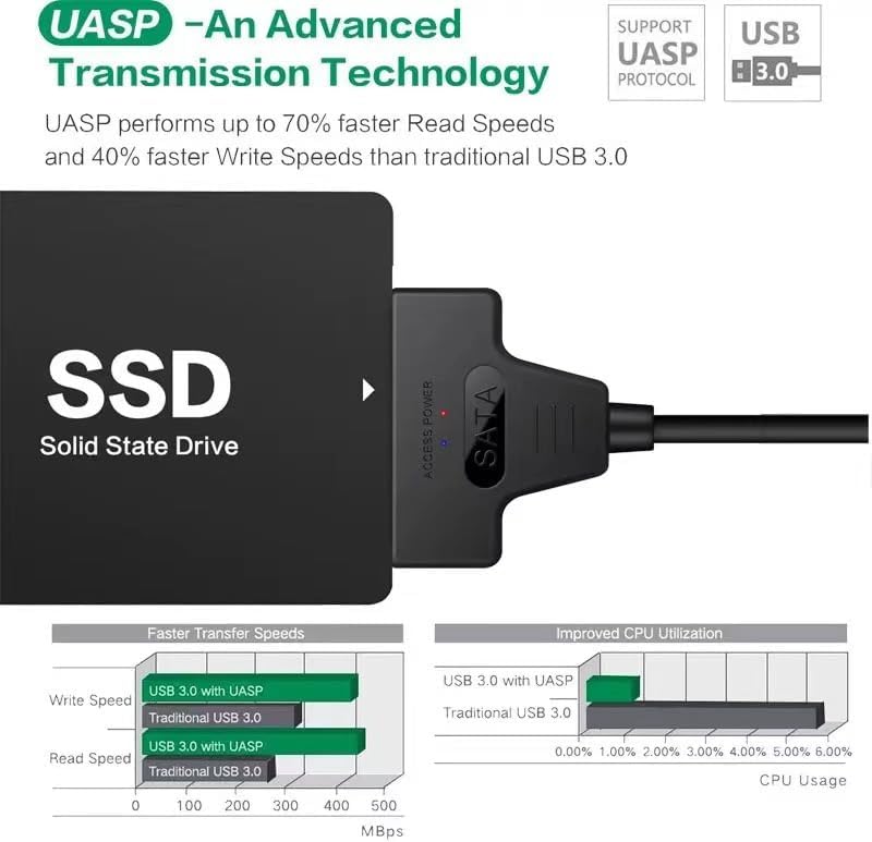【Universal SATA to USB Adapter】 This versatile SATA to USB adapter allows you to easily connect any 2.5-inch or 3.5-inch SATA hard drive (HDD) or solid-state drive (SSD) to your computer via a USB 3.0 port. It functions as an external enclosure converter, making it a perfect USB to SATA hard drive adapter for data recovery, drive cloning, or extra storage.