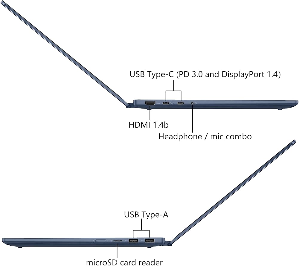 • 【External Ports and Slots】: 2x USB Type-A, 2x USB Type-C, 1x HDMI 1.4b, 1x Headphone / microphone combo jack (3.5mm), 1x microSD card reader
