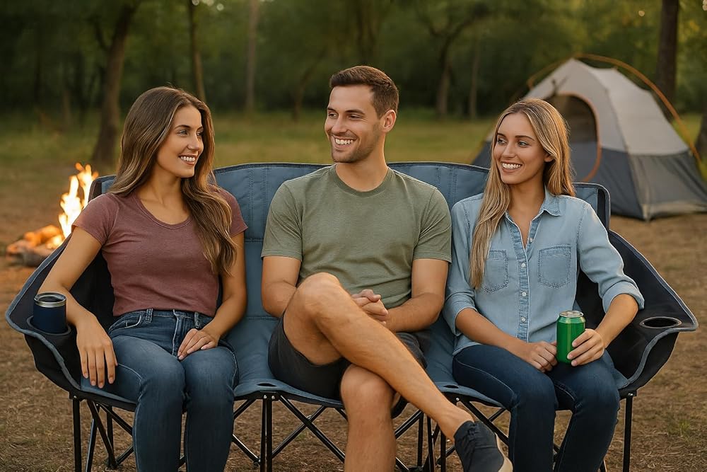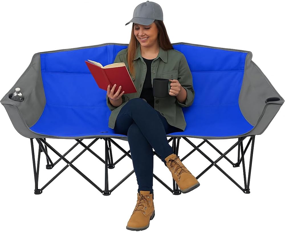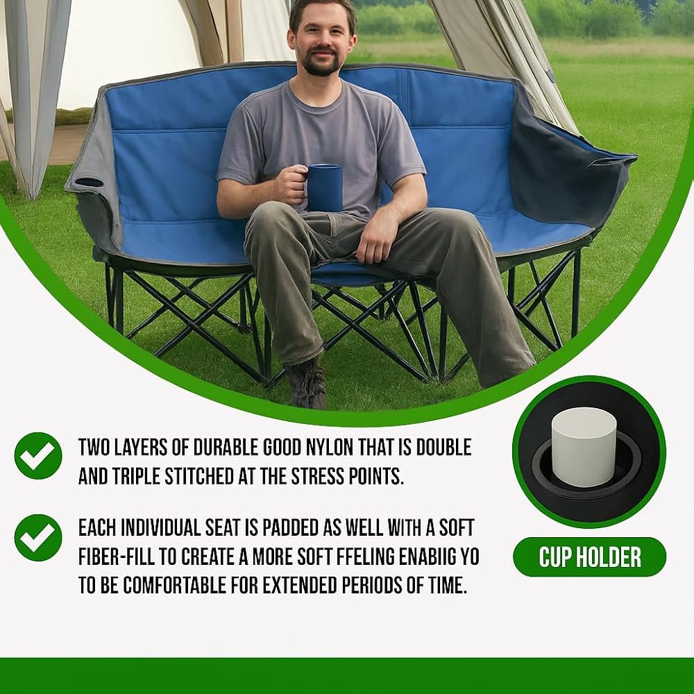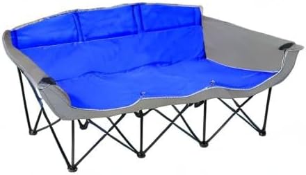 اذهب إلى الفريق! أريكة محمولة قابلة للطي - كرسي خارجي قابل للطي بثلاثة مقاعد مع حاملات أكواب وحقيبة حمل - نايلون 600D عالي التحمل للتخييم والرياضة والتخييم والشاطئ والفناء الخلفي (أزرق/رمادي)
