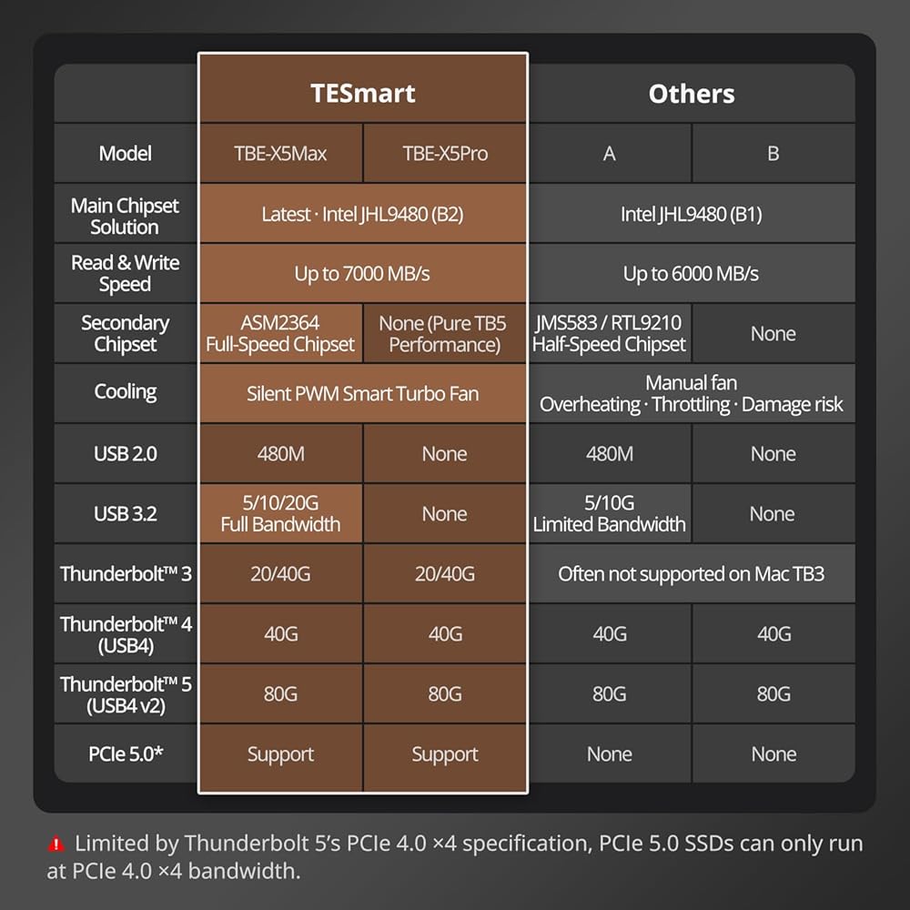 مدعوم بشريحة JHL9480 - تم تصميمه باستخدام وحدة تحكم JHL9480 (B2) المتقدمة، يوفر غلاف Thunderbolt 5 أداءً على مستوى PCIe، مما يجعل محركات أقراص NVMe SSD الخارجية تعمل كما لو كانت مثبتة مباشرة في جهاز الكمبيوتر الخاص بك، مما يضمن زمن وصول منخفض ونقل بيانات ثابت لتحرير الفيديو والعرض ثلاثي الأبعاد وغيرها من مهام إنشاء المحتوى المطلوبة.