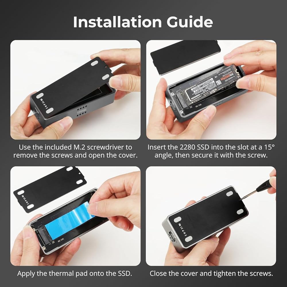 محتويات العبوة - 1 × حاوية SSD بسرعة 80 جيجابت في الثانية، و1 × كابل USB-C بسرعة 80 جيجابت في الثانية (19.68 بوصة)، و1 × دليل المستخدم، و2 × وسادات حرارية من السيليكون، و1 × مفك براغي مغناطيسي لسهولة التركيب