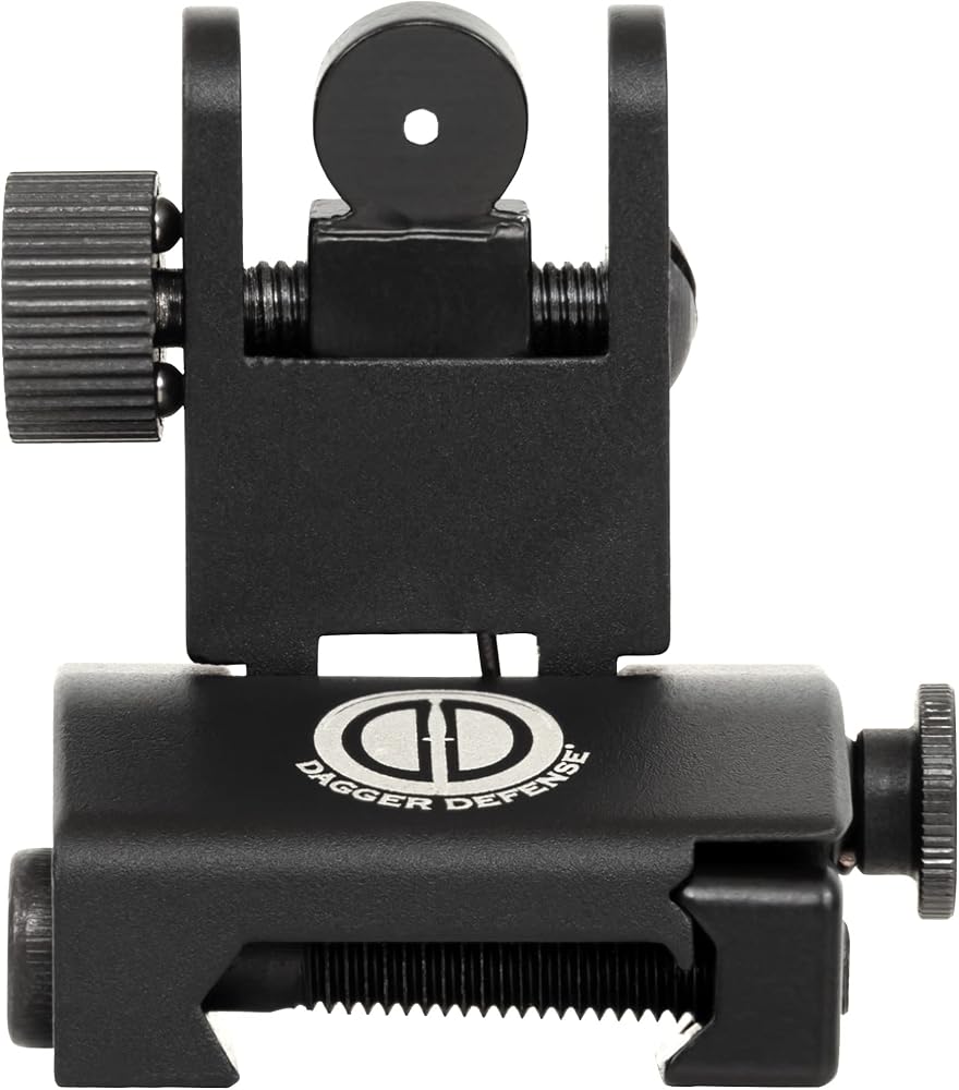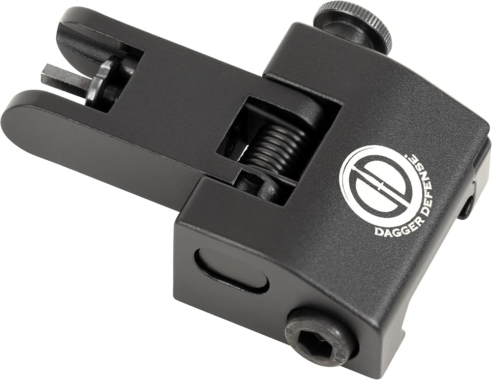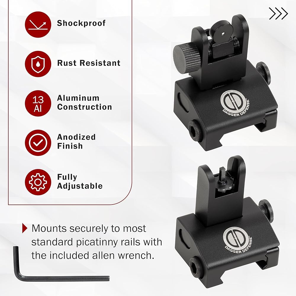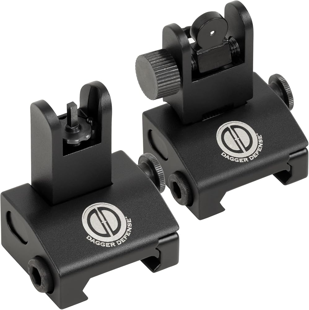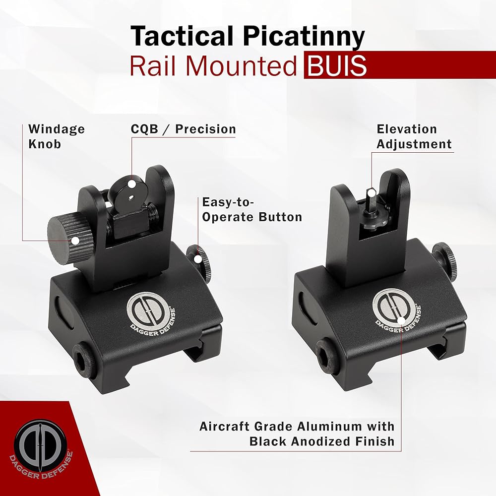 Dagger Defense (A Veteran owned company) offers its tactial BUIS backup iron sights for use on standard picatinny rail mounts. A must have accessory for your picatinny rail systems. Has spring loaded, button activated flip up function to give you the extra advantage. ATTENTION: The push button on the sights doubles as the spring loaded retention knob. You can turn the push button clockwise/counterclockwise to ensure the sights stay in the (down) locked position with the proper tension. Use in combination with red dots, holographic sights and scopes. Made of aluminum alloy in a black matte finish. A great accessory for your tactical items.