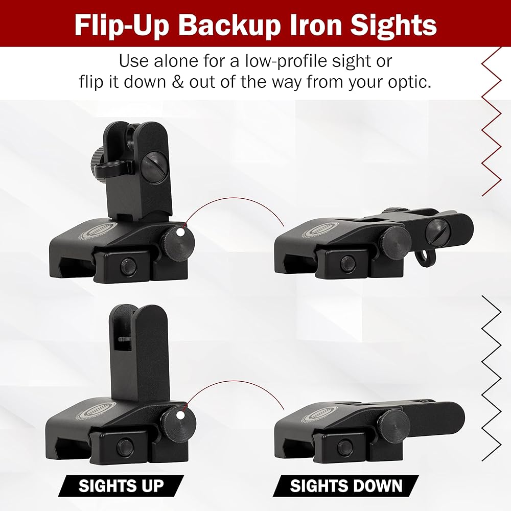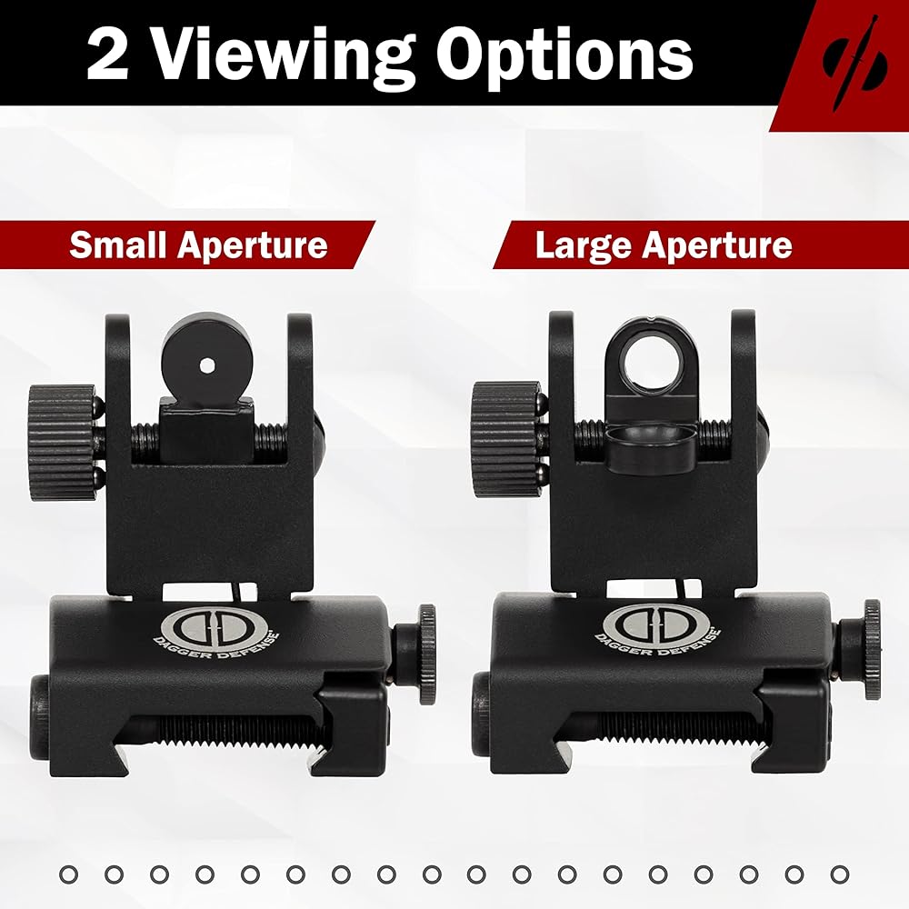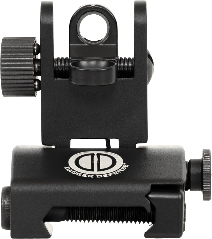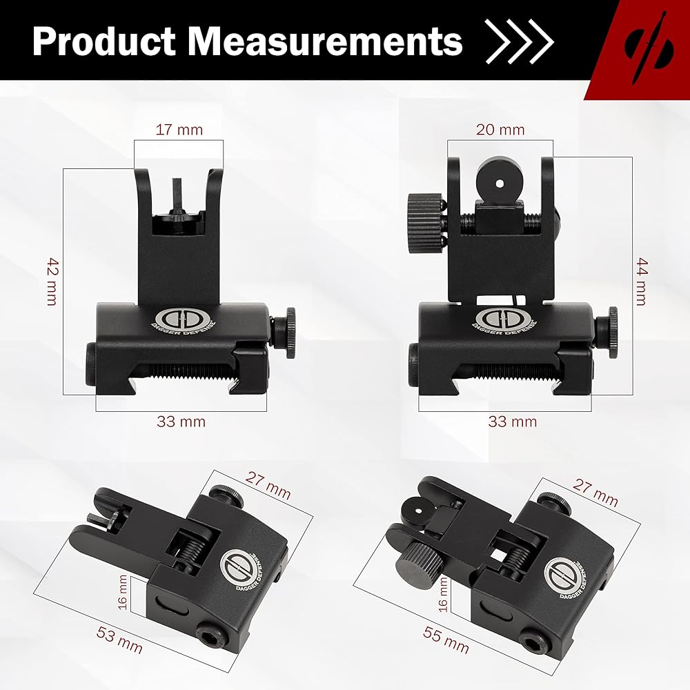 Dagger Defense (A Veteran owned company) offers its tactial BUIS backup iron sights for use on standard picatinny rail mounts. A must have accessory for your picatinny rail systems. Has spring loaded, button activated flip up function to give you the extra advantage. ATTENTION: The push button on the sights doubles as the spring loaded retention knob. You can turn the push button clockwise/counterclockwise to ensure the sights stay in the (down) locked position with the proper tension. Use in combination with red dots, holographic sights and scopes. Made of aluminum alloy in a black matte finish. A great accessory for your tactical items.