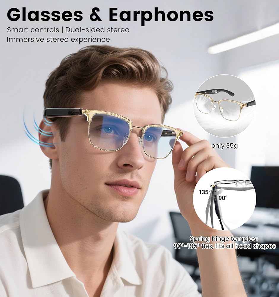 ✔️Experience the Future on Your Face In today's digital world, your glasses shouldn't just help you see – they should connect, protect, and set you free. Meet the Bluetooth Audio Smart Glasses: where cutting-edge tech meets effortless style. ✔️Key Innovations: - Intelligent Auto-Connect Hall sensor tech activates the moment you open the temples. Bluetooth 5.4 pairs instantly to phones/tablets – no menus, no waiting. Close them to conserve battery. *Simplicity redefined.* ✔️ Protect Your Eyes, Elevate Your Ears Blue light filtering lenses shield against screens and sunlight (photochromic-like adaptability). Meanwhile, open-ear acoustic drivers pump rich, leak-reduced audio without blocking ambient sound – crucial for runners, cyclists, and safety-conscious users. ✔️Control Your World by Touch Adjust volume, skip tracks, answer calls, or even trigger your phone's camera with intuitive temple taps. Voice command support (triple-tap) lets you navigate, message, or play music hands-free. *Your fingertips run the show.* ✔️Engineered for Real Life We tested it for work (zoom calls), travel (airplane mode), fitness (sweat-proof IPX4), and leisure (6hr music marathons). The spring hinges fit glasses-wearers and non-wearers alike. At 35g, you'll forget they're tech. ✔️Tech Specs That Matter: ▶ BT Version: 5.4 | ▶ Charging: Magnetic (1hr) ▶ Playtime: 5-6h | ▶ Standby: 7 days ▶ Weight: 35g (frame only) | ▶ Frame: Stainless Steel + PC ▶ Lens: Anti Blue Light Polycarbonate ✔️Finally, Glasses That Do More Upgrade from ordinary bluetooth sunglasses or clunky headphones. Whether you're a multitasking professional, outdoor explorer, or style-driven urbanite – the GT-33 adapts. Click [Add to Cart] to own the ultimate audio-visual companion.