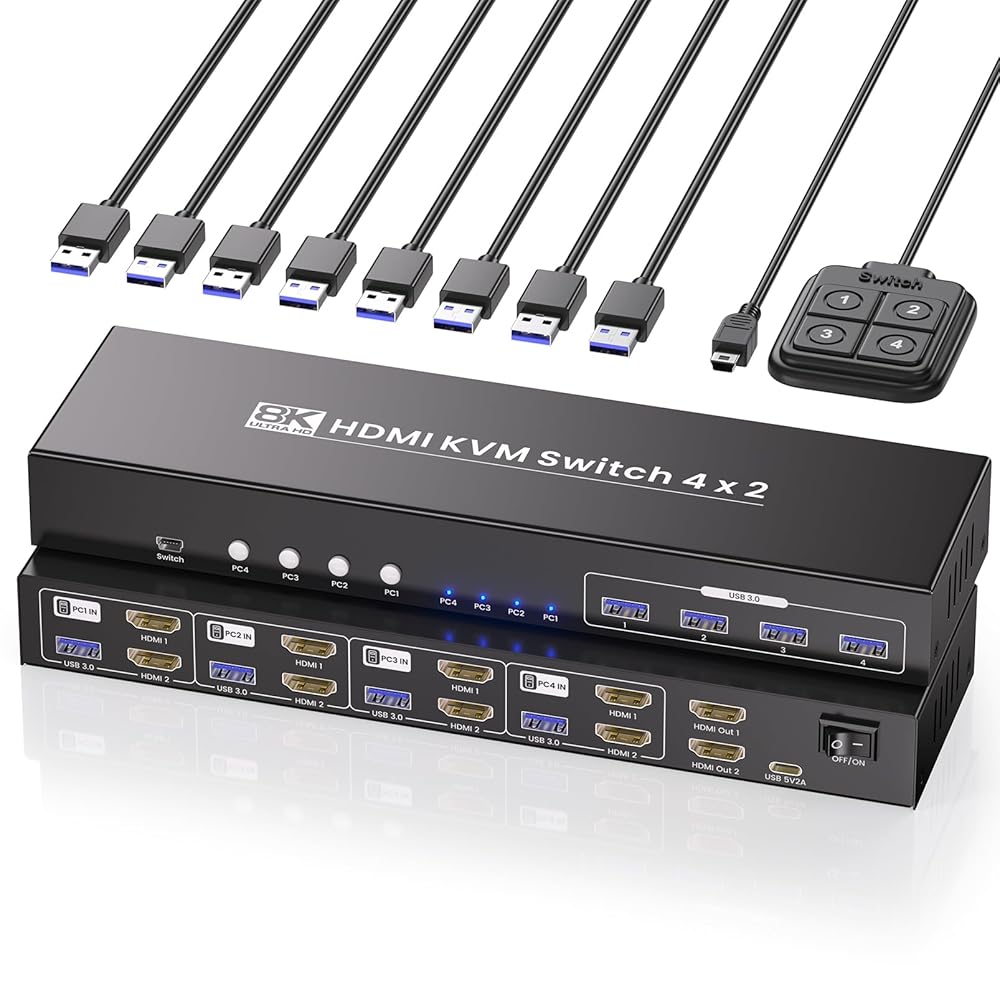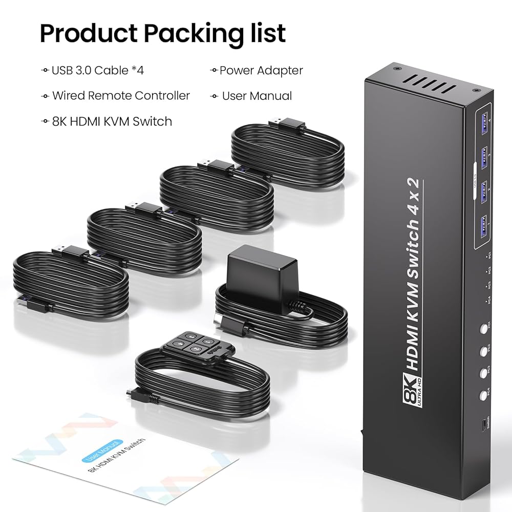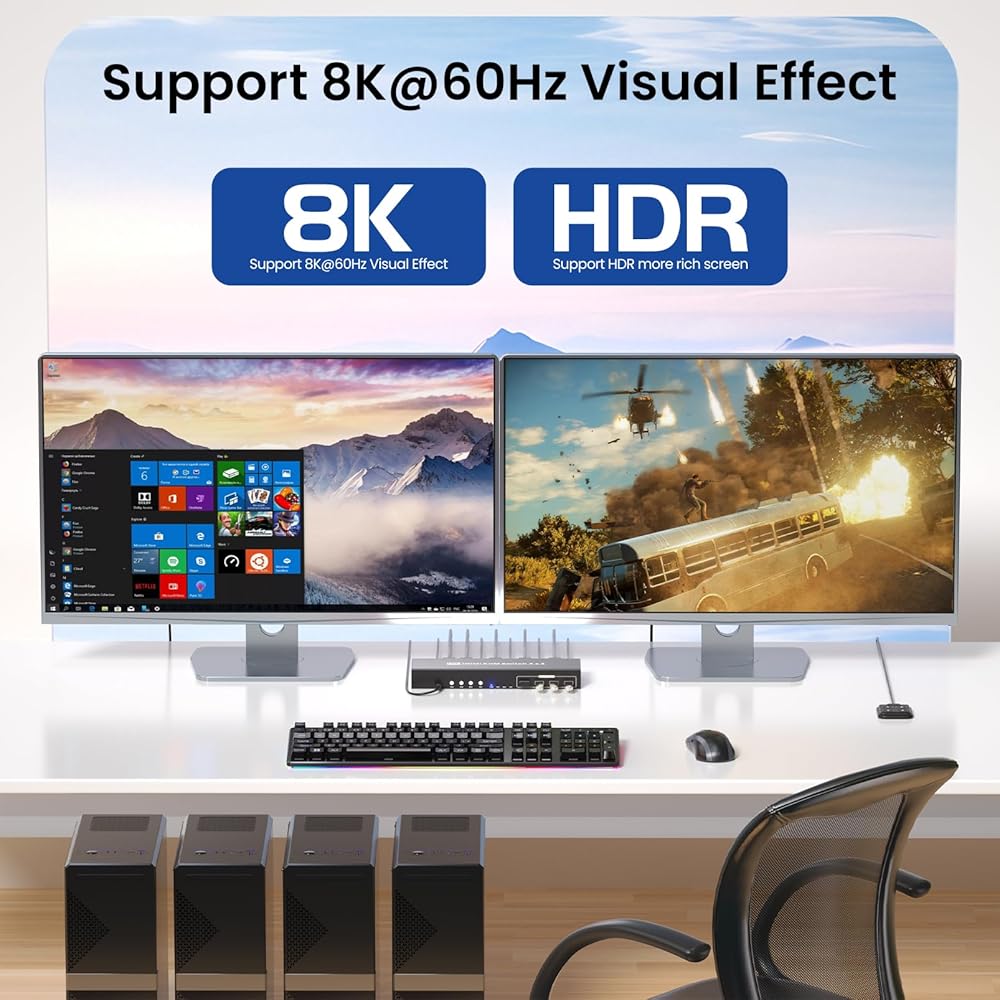 • 【أداء مرئي 8K60 هرتز و4K120 هرتز】شاهد كل التفاصيل بوضوح مذهل مع دعم كامل لما يصل إلى 8K (7680 × 4320) عند 60 هرتز - يعد مفتاح KVM مثاليًا لمصممي الجرافيك الذين يقومون بتحرير الصور عالية الدقة، أو محرري الفيديو الذين يعملون على لقطات 8K، أو اللاعبين الذين يطاردون اللعب الغامر. يتعامل محول KVM ذو المنفذين أيضًا مع دقة 4K بسرعة 120 هرتز، مما يضمن عدم وجود أي تأخير أو تشويه للبكسل - سواء كنت تتسابق عبر مستوى اللعبة أو تقوم بالتمرير عبر جداول البيانات التفصيلية. ملاحظة: للحصول على أداء 8K، يجب أن يدعم جهاز الكمبيوتر والشاشة وكابلات HDMI دقة 8K.