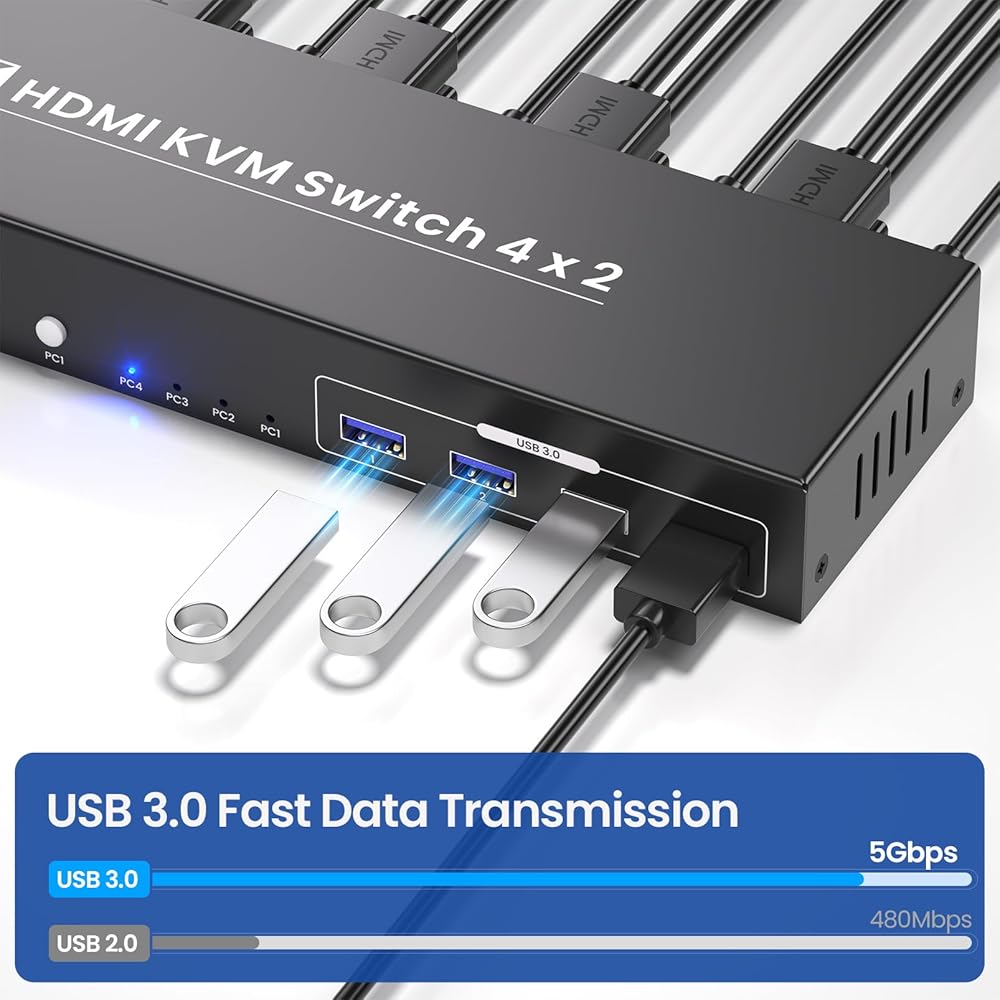 • [اتصال USB 3.0 فائق السرعة] حافظ على إنتاجيتك باستخدام منافذ USB 3.0 المدمجة التي توفر سرعات نقل بيانات تصل إلى 5 جيجابت في الثانية. شارك الملفات بين جهازي الكمبيوتر لديك في ثوانٍ، أو قم بتوصيل الأجهزة الطرفية الأساسية مثل القرص الصلب الخارجي أو الطابعة أو الماسح الضوئي أو الماوس/لوحة المفاتيح. يعمل مفتاح KVM ثنائي المنفذ هذا على تحويل محور USB واحد إلى مورد مشترك لكلا جهازي الكمبيوتر.