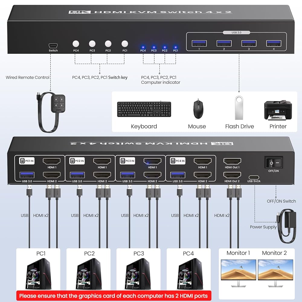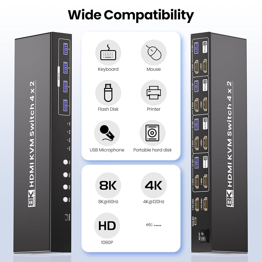 • 【يعمل مع الأجهزة تقريبًا】تم تصميم جهاز الكمبيوتر KVM Switch 1 Monitor 2 للعمل بسلاسة مع مجموعة واسعة من الأجهزة، بما في ذلك أنظمة التشغيل Windows وm-a-cOS وLinux. وهو يدعم HDMI 2.1 وهو متوافق مع الإصدارات السابقة بدقة 4K ودقة أقل، مما يضمن إعدادًا وتشغيلًا خاليًا من المتاعب. ما عليك سوى توصيل كابلات HDMI وUSB، وستكون جاهزًا للانطلاق - بدون برامج، أو برامج تشغيل، أو متاعب.