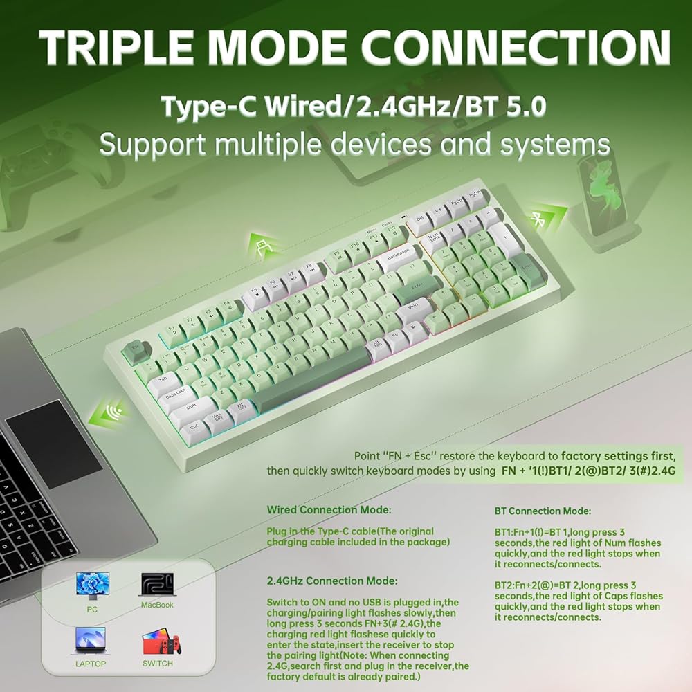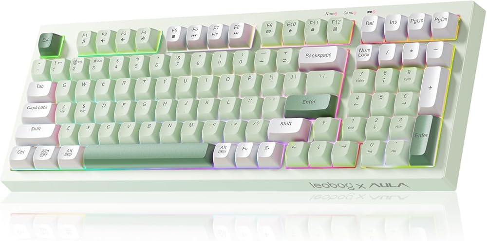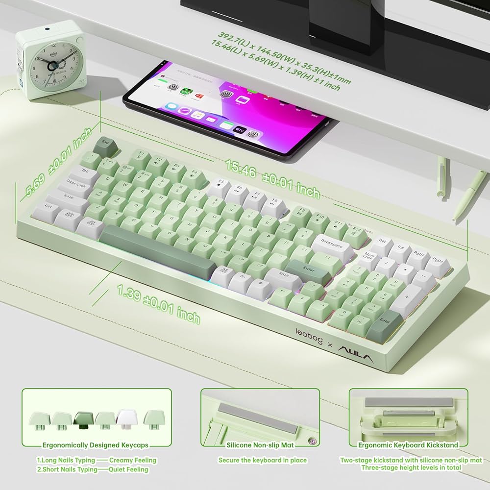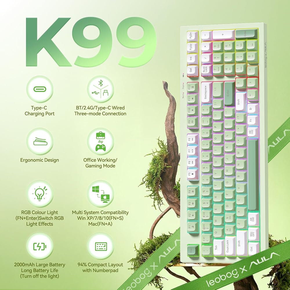 لوحة مفاتيح الألعاب LEOBOG x Aula، لوحة مفاتيح كريمية لاسلكية، لوحات مفاتيح كمبيوتر بلوتوث، شعور ميكانيكي بالحجم الكامل مع لوحة أرقام تضيء RGB بإضاءة خلفية ثلاثية الوضع BT/2.4 جيجا هرتز/USB-C - K99 أخضر