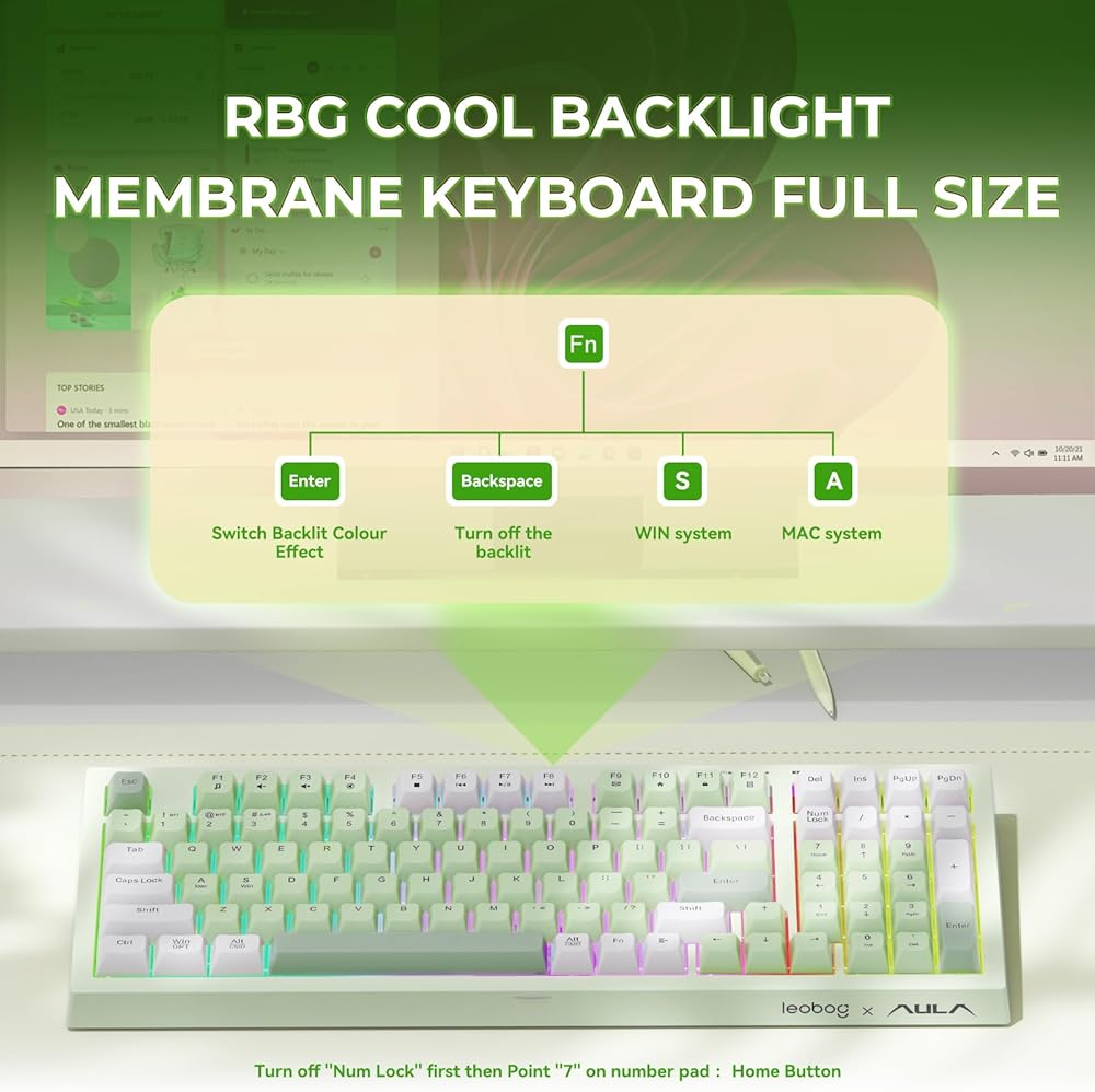 • لوحة مفاتيح العمل المكتبية: مع تأثير إضاءة RGB لإضافة جو رائع إلى المكتب وغرفة الألعاب من خلال وظيفة مجموعة المفاتيح FN+. لوحة مفاتيح USB لطيفة من Leobog x aula متوافقة مع نظام Win وMac إلخ.