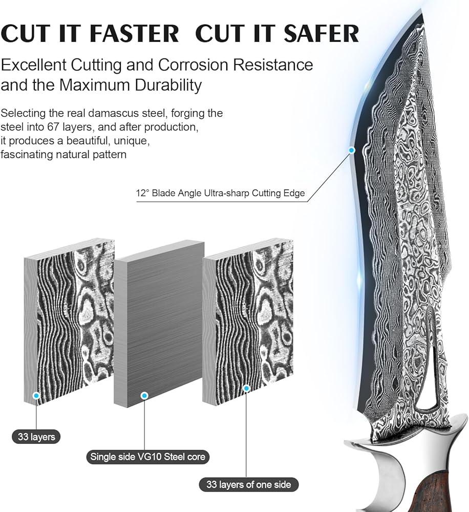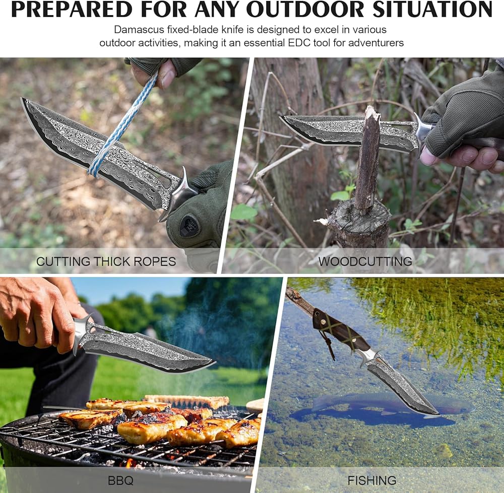 • متانة استثنائية: كل سكين صيد دمشقي هو تحفة مصنوعة يدويًا. مصنوعة من الفولاذ الدمشقي الحقيقي الفاخر المكون من 67 طبقة، وتتميز سكينة الشفرة الثابتة الدمشقية بقلب VG10 لحدة ومتانة لا مثيل لهما. تم تصميم سكين الشفرة الثابتة للتفوق في مختلف الأنشطة الخارجية، مما يجعلها أداة EDC أساسية للمغامرين