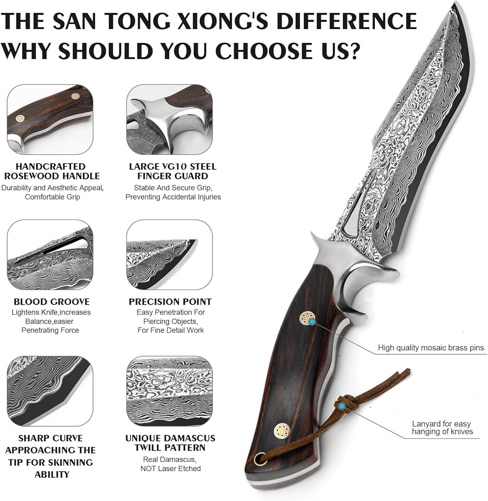 • سكين متعدد الاستخدامات: سكين الصيد المصنوع يدويًا من الفولاذ الدمشقي مثالي لمجموعة متنوعة من المهام، بما في ذلك الصيد والتخييم والبقاء على قيد الحياة والحماية في الهواء الطلق. إن شفرتها الحادة وبنيتها القوية تجعلها أداة موثوقة لأي نشاط خارجي. توفر سكاكين وأدوات SAN TONG XIONG خدمة مدى الحياة ضد العيوب في المواد والصناعة