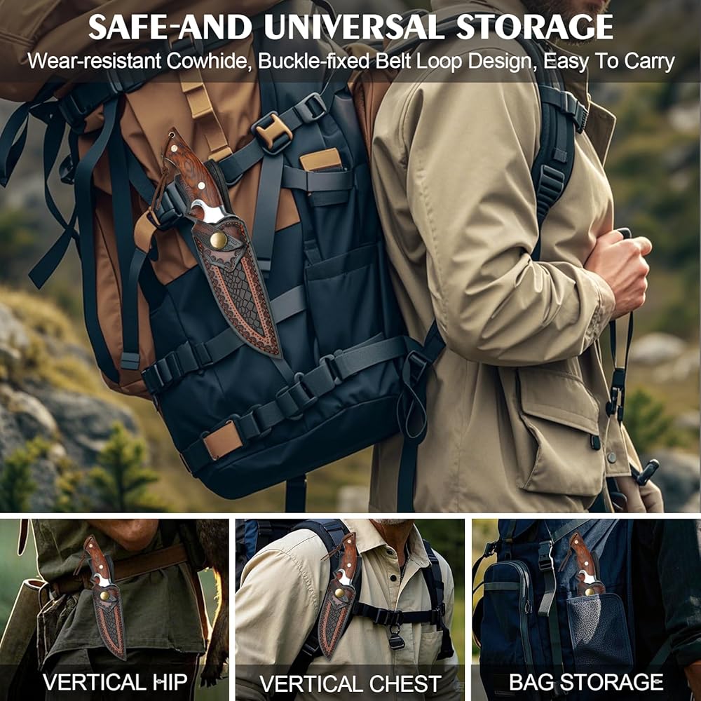 • نقل مريح وآمن: تأتي سكين الصيد ذات الشفرة الثابتة مع غمد جلدي عالي الجودة يحمي الشفرة، وتتميز بحلقة حزام ومشبك كبس، مما يضمن النقل الآمن والأنيق في جميع المغامرات، وجاهز لتحمل جميع التحديات في الطبيعة.