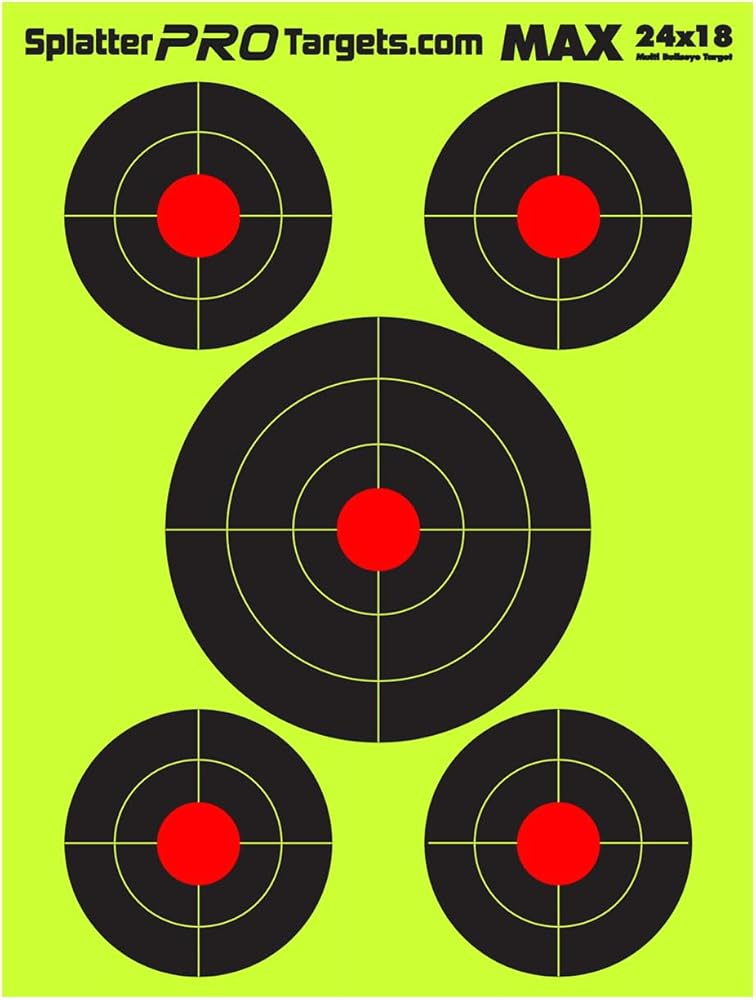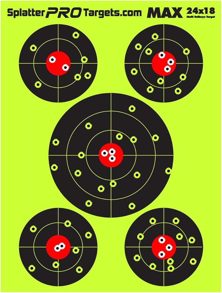 Compare our Splatter Targets to anything on the market. Our targets lay flat and STAY FLAT. If you've ever had a target curl up on you when you're at the range you know how frustrating that can be. Our targets are printed on sturdy 10 pt. board stock, not cheap paper. Our goal was simple. Make the best target on the market and we've done that. The Bright Yellow bullet holes are visible in all light conditions and help you quickly get on target and stay on target. Perfect for air guns, rim fire and center fire rifles and pistols. Our targets work great for sighting in shotguns as well.