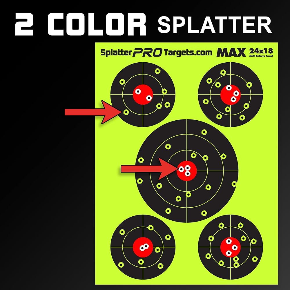 Two Color Splatter! Our HIGH VISIBILITY splatter targets make it EASY to see your shots at a distance, no more wasting time walking downrange to SEE YOUR SHOTS