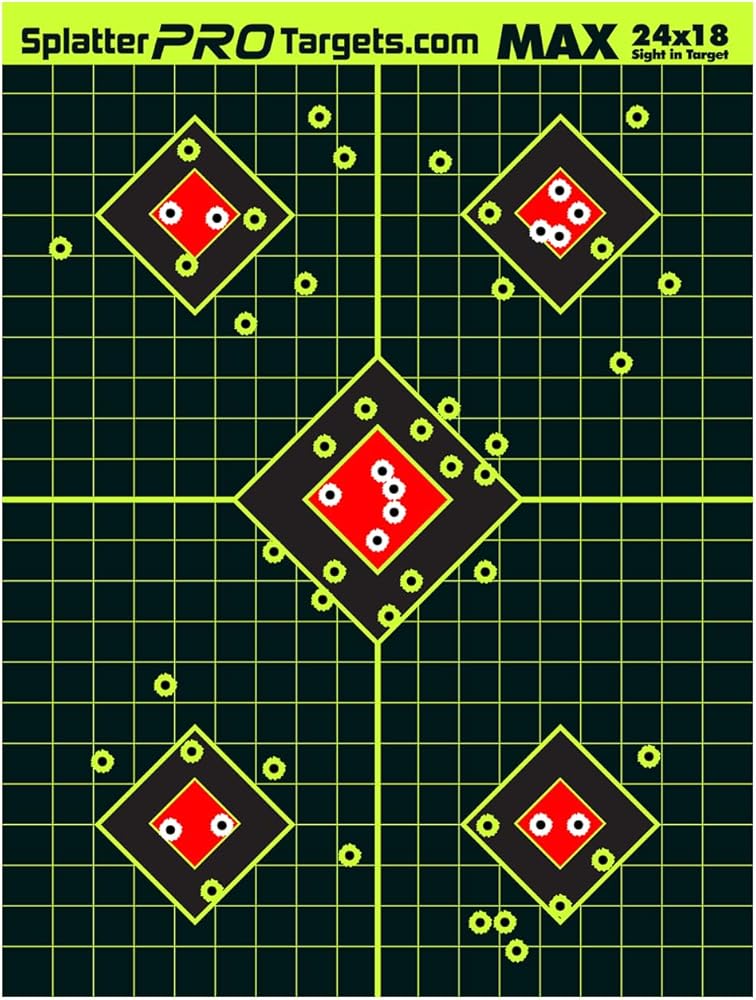 Compare our Splatter Targets to anything on the market. Our targets lay flat and STAY FLAT. If you've ever had a target curl up on you when you're at the range you know how frustrating that can be. Our targets are printed on sturdy 10 pt. board stock, not cheap paper. Our goal was simple. Make the best target on the market and we've done that. The Bright Yellow bullet holes are visible in all light conditions and help you quickly get on target and stay on target. Perfect for air guns, rim fire and center fire rifles and pistols. Our targets work great for sighting in shotguns as well.
