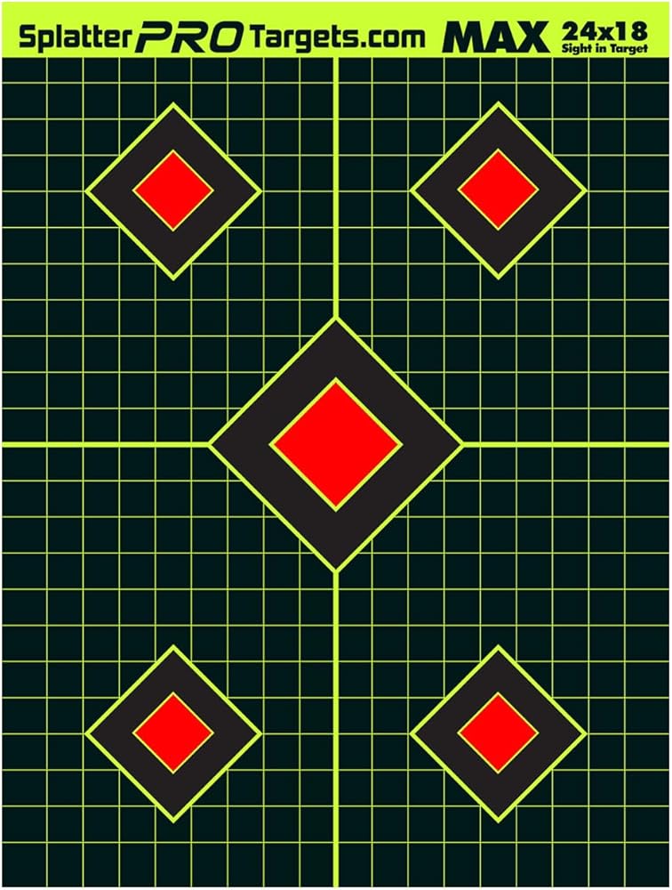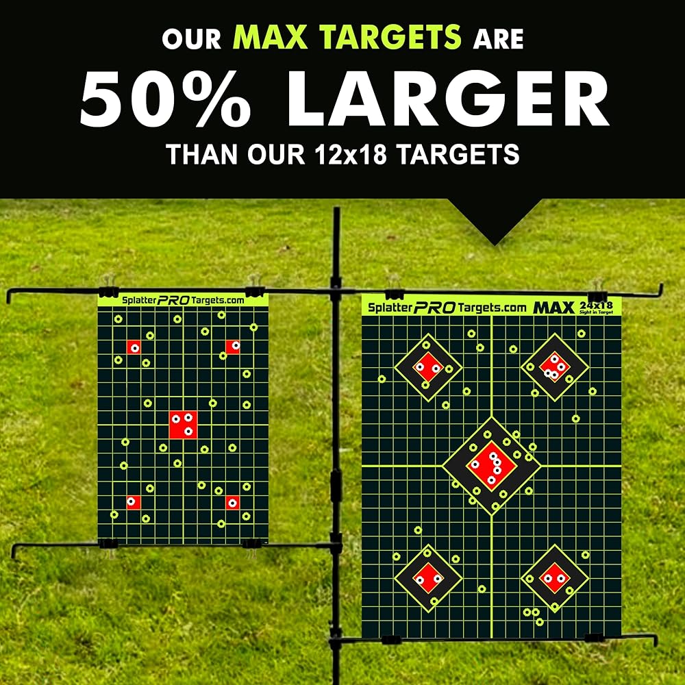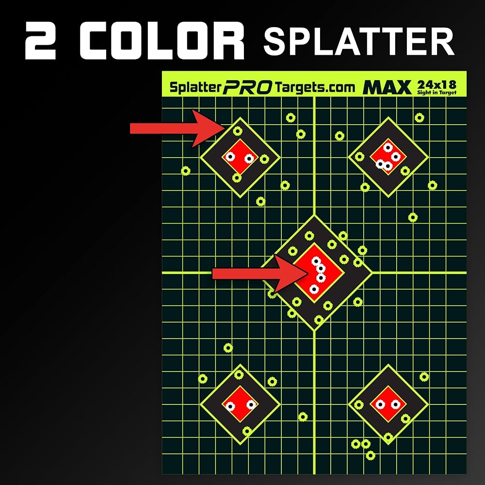 18x24 Extra Large Splatter Targets. Two Color Splatter to Easily See Your Shots! Bright Fluorescent Yellow and White Splatter. Fully Reactive Targets. See Your Hits and Your Misses!