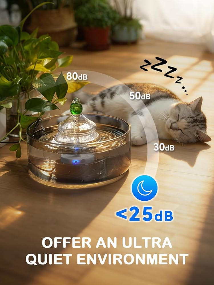 Attractive Spring Flowing: The glass cat water fountain features a spring-like water flow design, with a stunningly smooth stream that combines function and elegance. The gentle bubbling pet fountain provides a natural forest water park that encourages your kittens to drink.