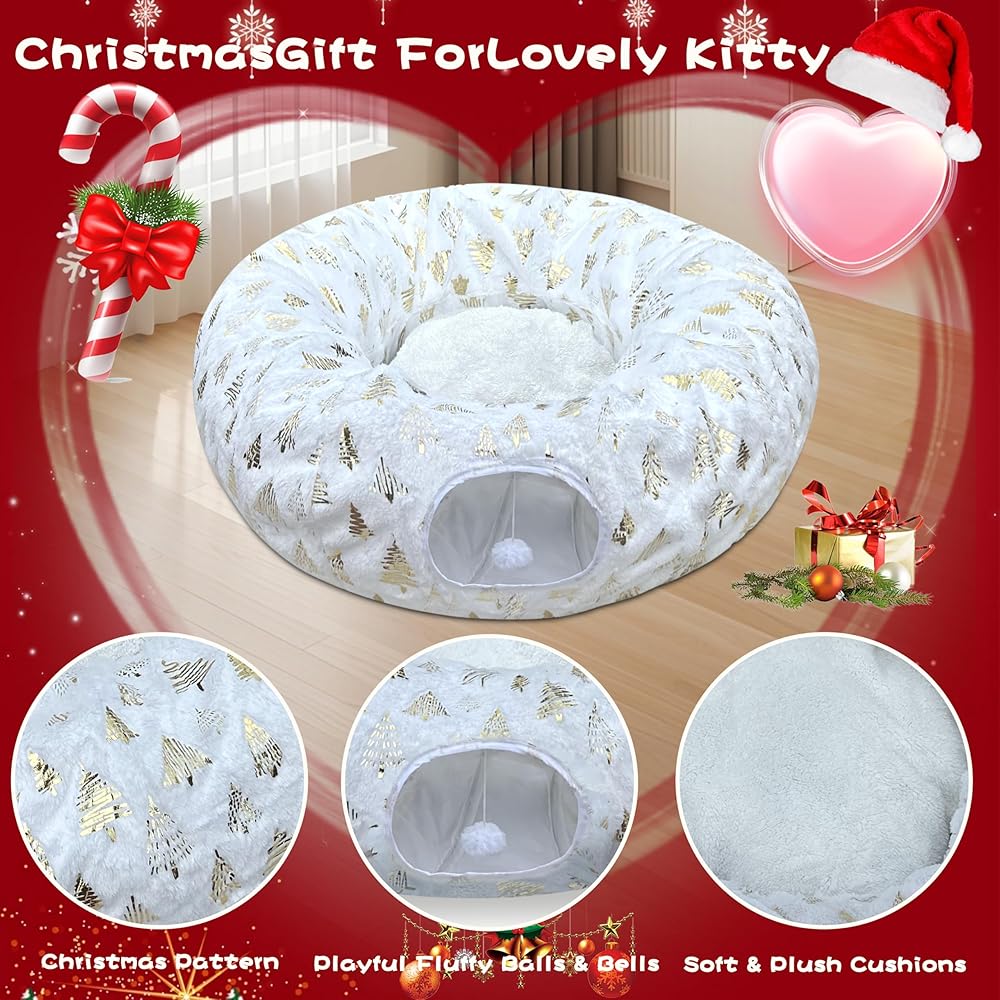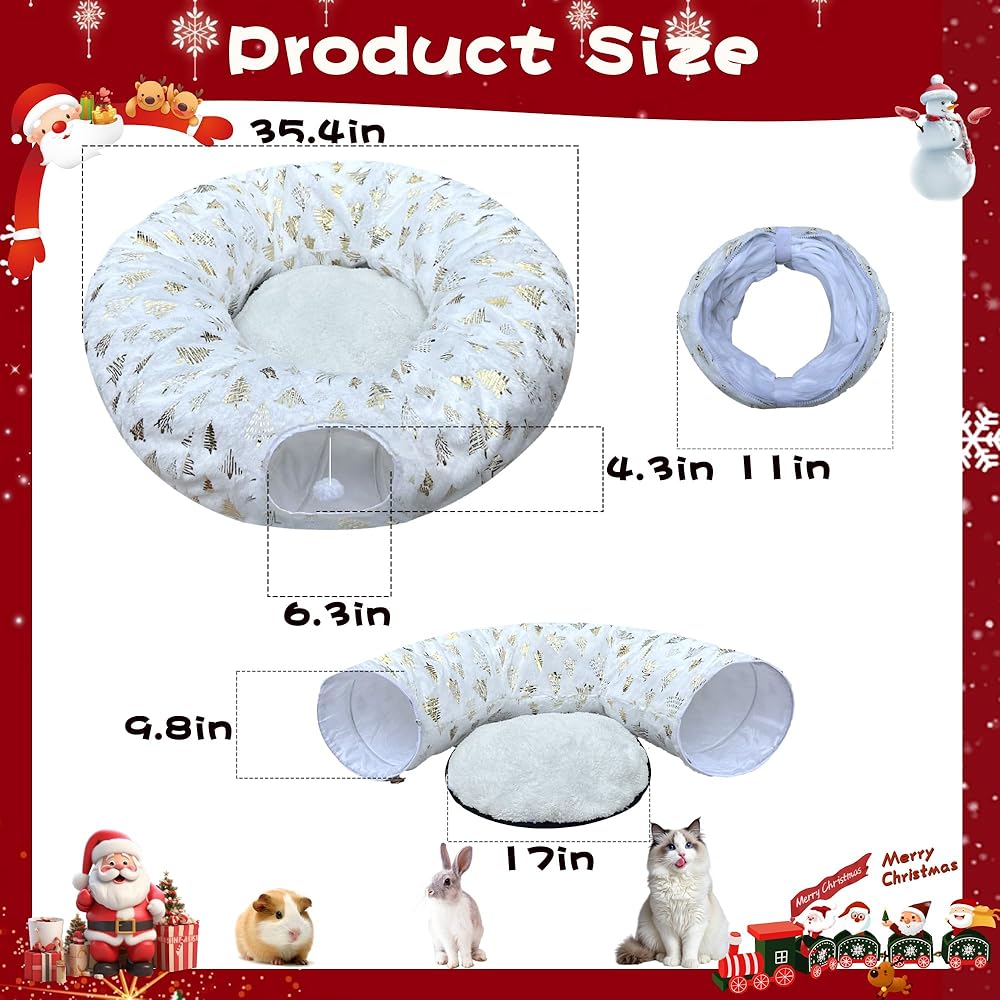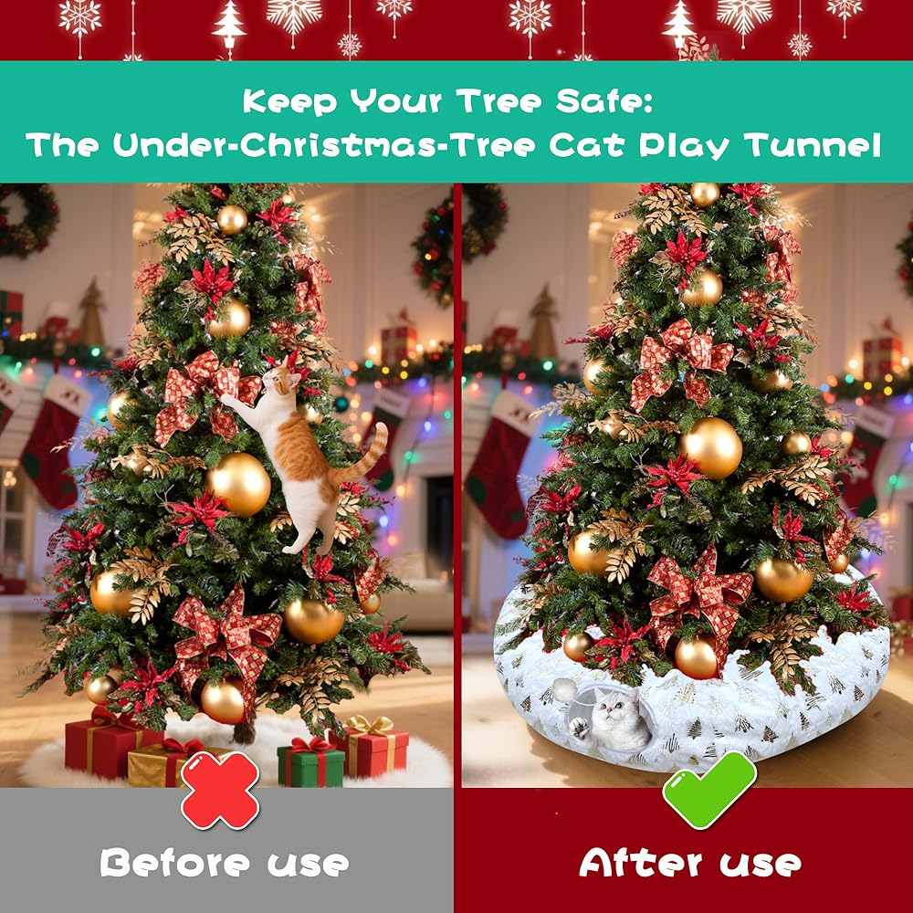 Wrap your tree in cozy elegance! LUCKITTY's cat tunnel combines festive Christmas tree prints with plush red jacquard fabric for a luxe yet functional solution. This ultra-soft, 10-inch tall tunnel hides beneath your tree, its dangling ball luring cats away from fragile decor. The tightly woven jacquard cushions paws while resisting claws – no more scratched ornaments! Double-stitched seams ensure durability during pouncing sessions. Plus, the rich red hue and raised tree motifs blend beautifully with holiday lights. Safety never looked so stylish – give cats joy and your tree glamorous protection!
