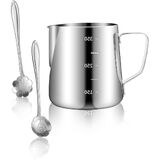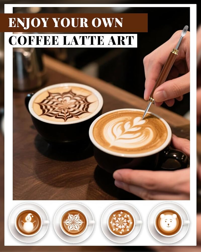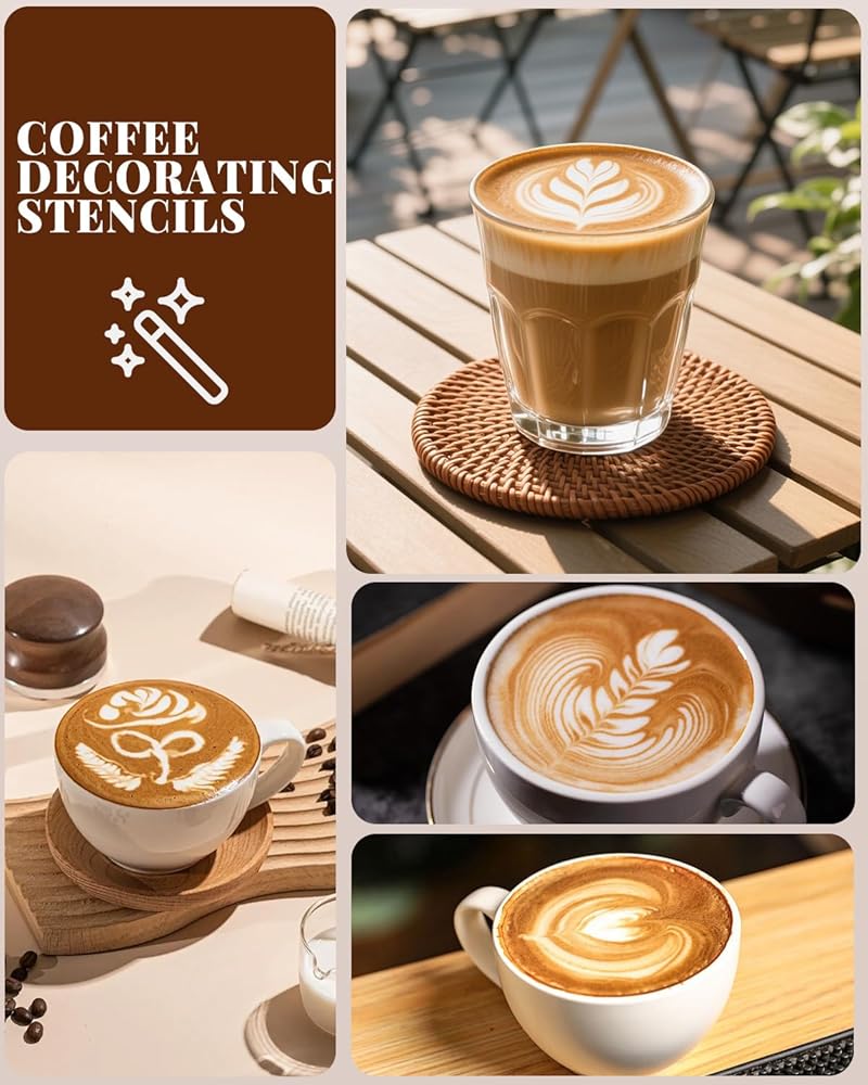 Coffee Making Tool Set---What you will get? 1 PC 600ML milk frothing pitcher with measuring marks on both sides, ensuring you have the perfect amount of milk for your coffee creations. This milk pitcher for espresso machine is designed for easy frothing and pouring. Included are 16 PCS different coffee decorating stencils, 1 PC latte art pen, and 1 PC coffee powder shaker with lid. A variety of combinations and different styles meet all your needs, bringing you more happiness when you enjoy your coffee.