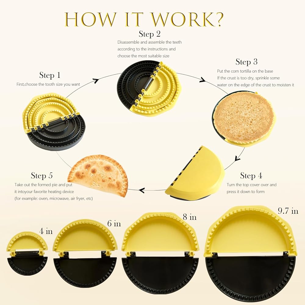 More Than a Tortilla Sealer: The extra 4-inch inner ring lets you make homemade empanadas or dumplings , Seal 10-inch burritos, 8-inch fajita wraps, 6-inch tacos, or 4-inch mini pies – all with one device.