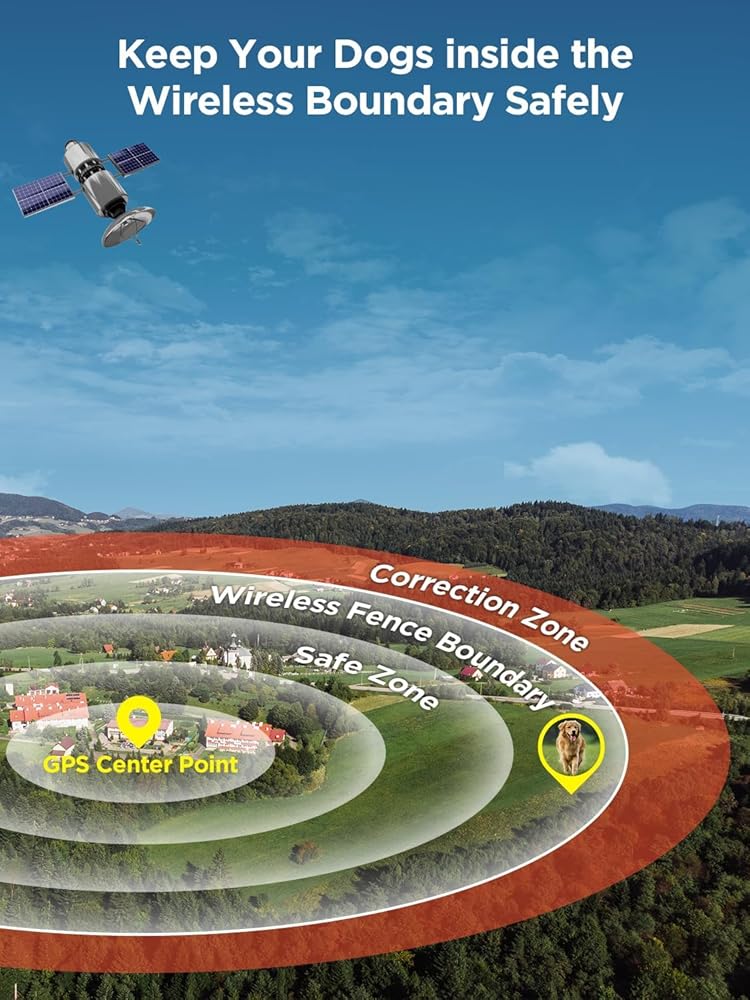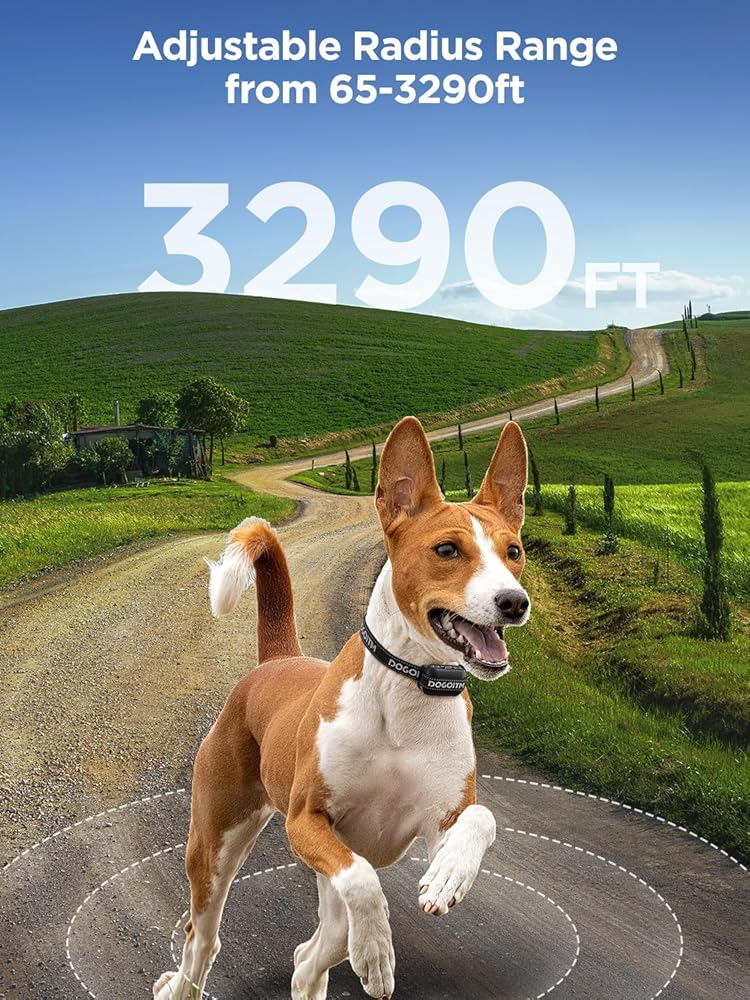 [نطاق تحكم طويل جدًا] تم تصميم جهاز GPS الخاص بنا خصيصًا للمراقبة الخارجية. الحد الأدنى لنصف القطر الذي يمكن التحكم فيه هو 65 قدمًا، ويمكن تعديل نطاق المسافة باستخدام المفاتيح لأعلى ولأسفل في الترس بمقدار 10 أقدام، ويمكن تعديل الحد الأقصى للمسافة إلى 3290 قدمًا. وهذا يلبي بسهولة احتياجات الكلاب المختلفة لنطاقات مختلفة من الأنشطة. ملاحظة مهمة: سياج الكلاب اللاسلكي GPS الخاص بنا غير مناسب للساحات الصغيرة (أقل من 0.3 فدان).