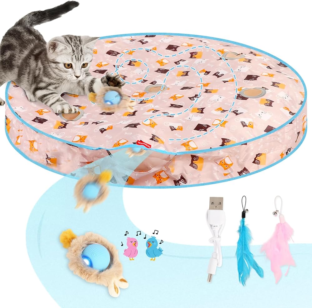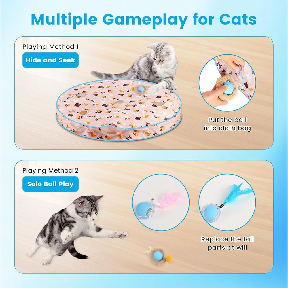 【لعبة الاختباء والبحث التلقائية للقطط 2 في 1】شاهد غرائز الصيد لدى قطتك تنبض بالحياة! تتميز ألعاب القطط الإلكترونية هذه بوجود كرة تندفع تحت غطاء، لمحاكاة الفريسة. مع خمس فتحات نظرة خاطفة على بساط لعب القطط، فهي ألعاب تفاعلية مثالية للقطط الداخلية، مما يوفر إثراء ومتعة لا نهاية لها.