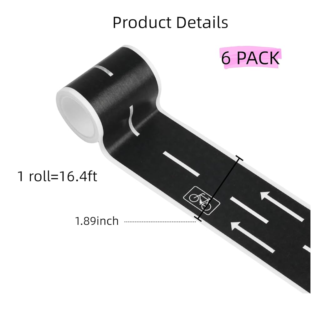 2.Pack List: This pack includes 6 rolls of traffic road tape. Each roll is 1.89" wide x 16.4 feet long—wide enough for epic multi-lane car track adventures. Includes bonus race car stickers, perfect as race car themed party decorations, train birthday decorations, or cars birthday decorations.