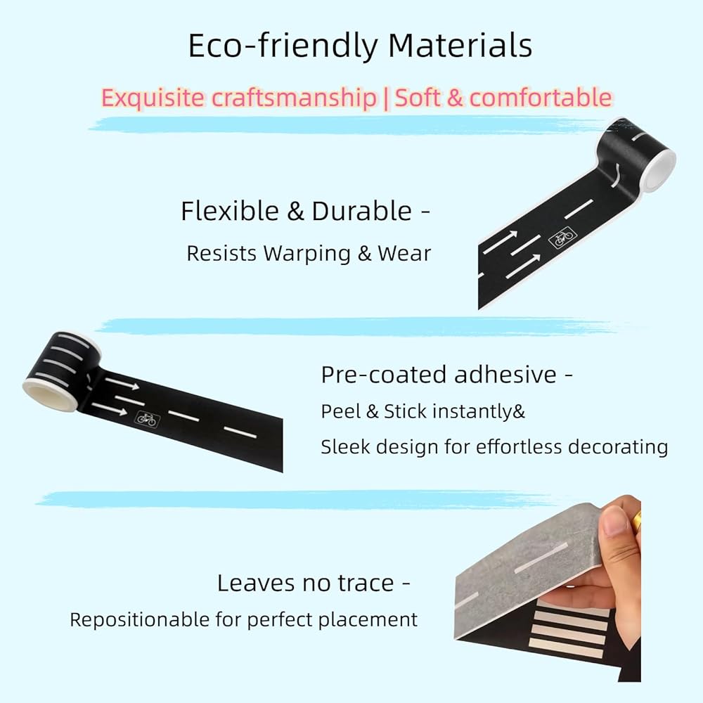 1.Safety First: Our road tape for toy cars is made from premium, safe materials. No scissors needed—this car tape tears easily by hand and peels cleanly off floors and walls without any sticky residue, ready for reuse again and again.
