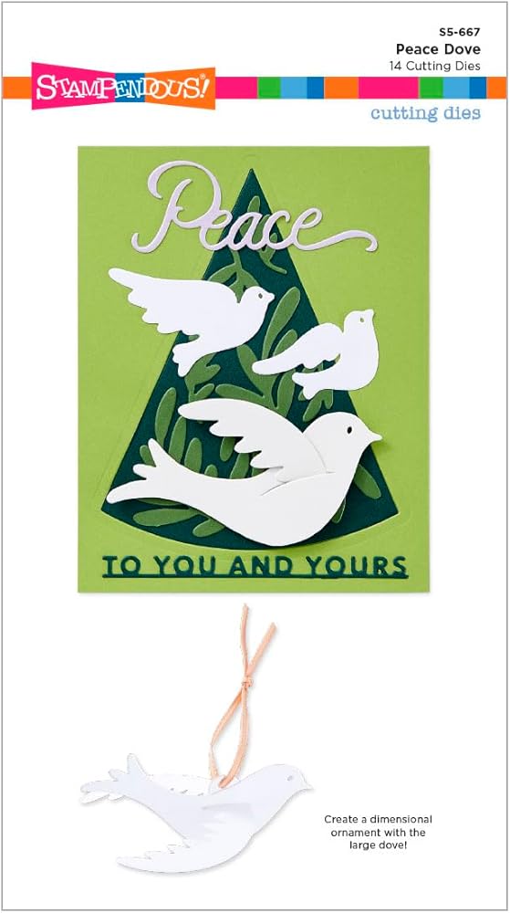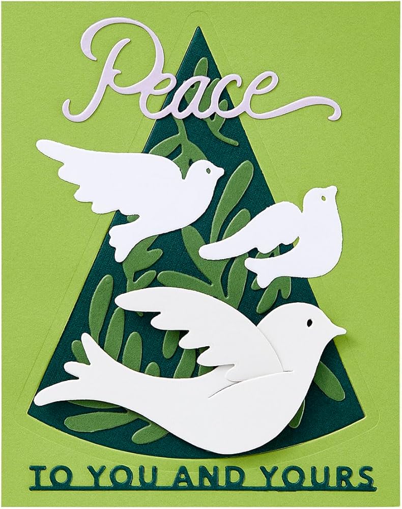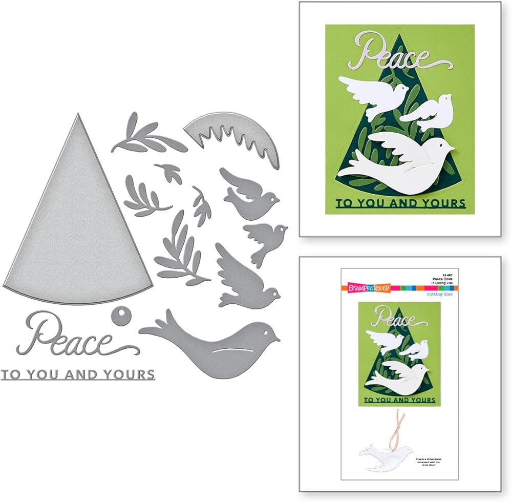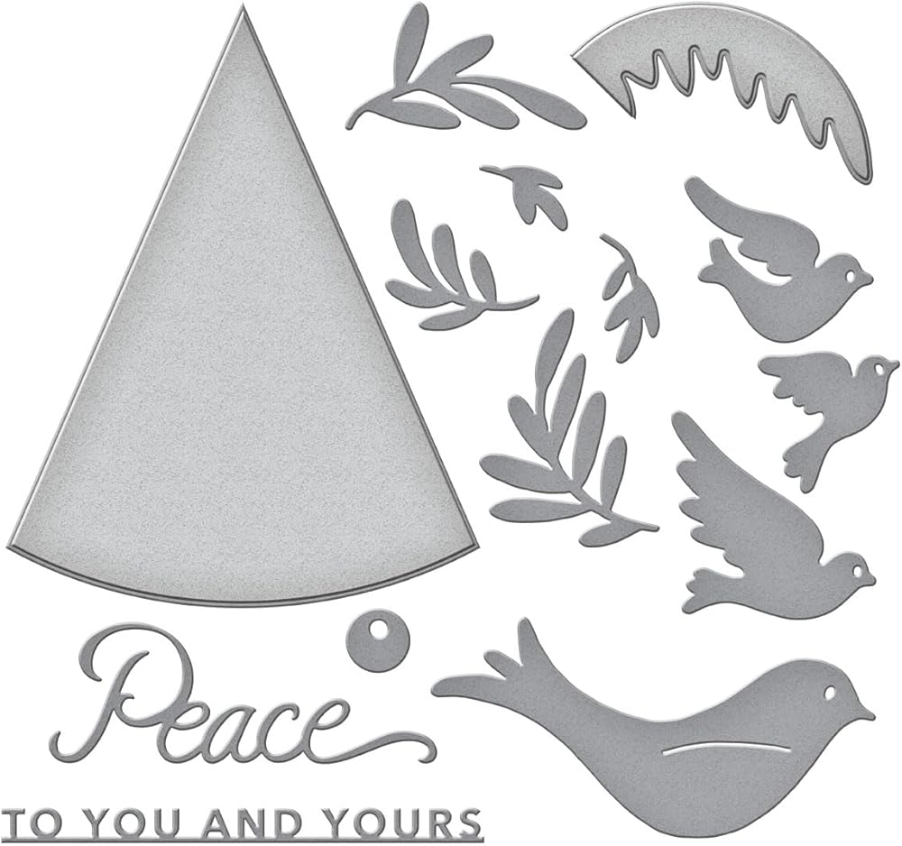 • This set of 14 thin metal cutting dies includes four different sizes of doves in flight, sprigs, a large triangle tree silhouette and two sentiments, Peace and To You and Yours. Cut all in the set to create a wonderful holiday card.