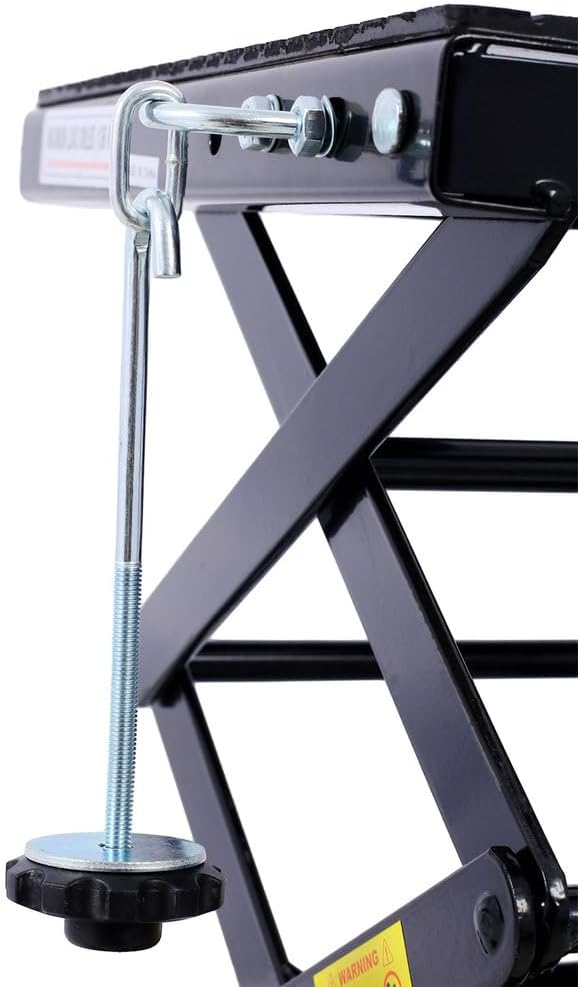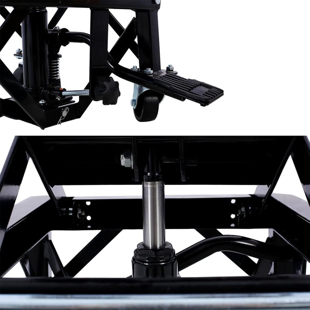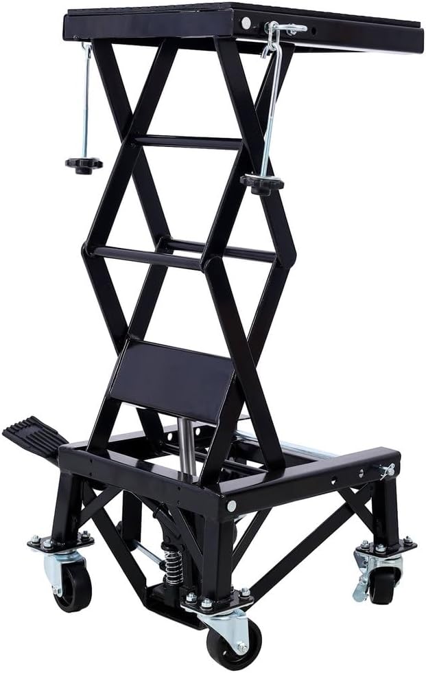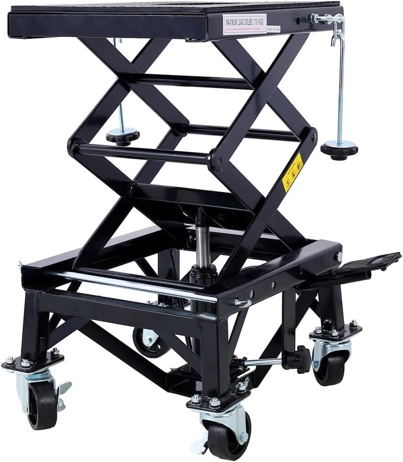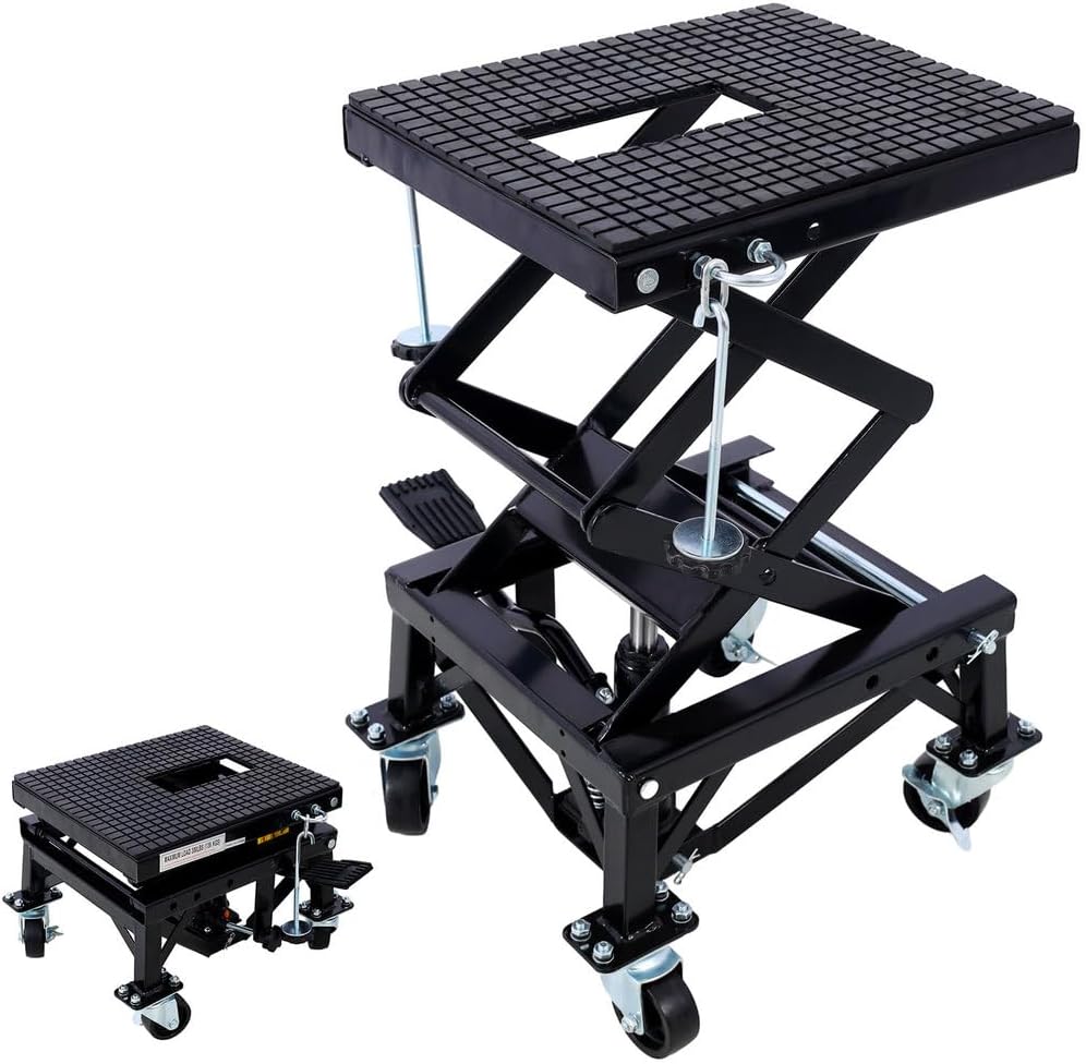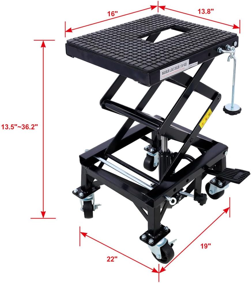 - Make motorcycle and dirt bike maintenance easier with this 300 lb hydraulic scissor lift table. Designed for riders who want reliable lifting performance without taking up excessive space, this stand combines strength, convenience, and mobility. The wide rubber deck raises your bike securely off the ground, offering better access for cleaning, chain adjustments, brake work, and seasonal storage.