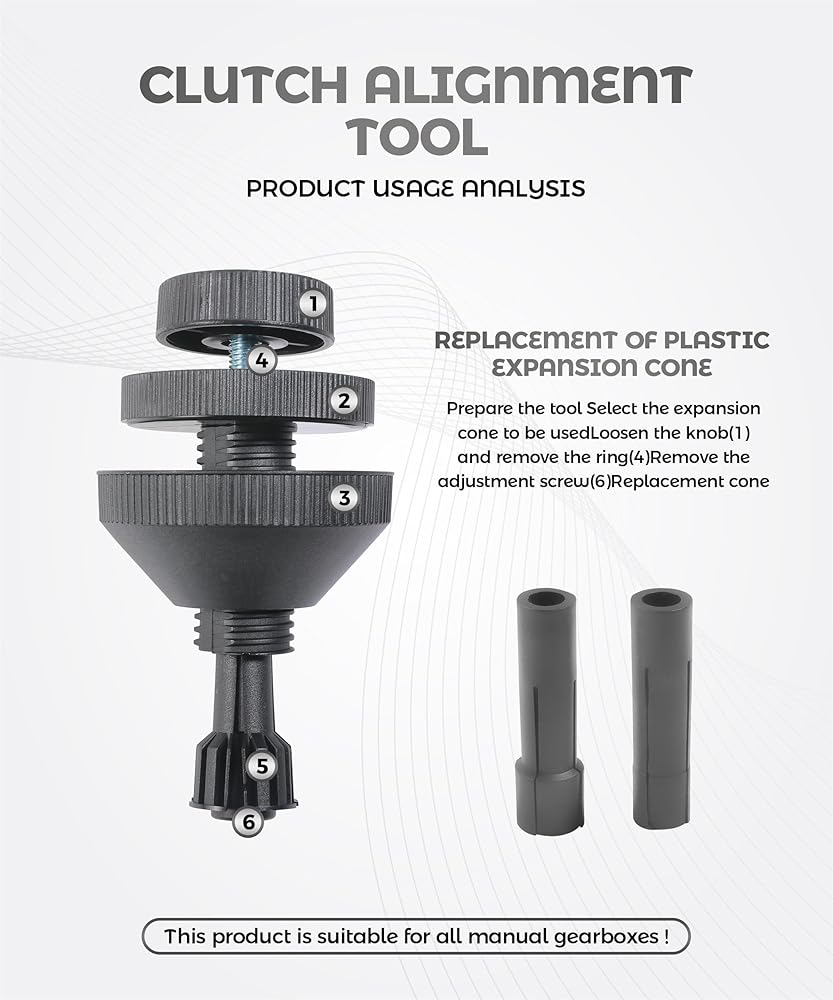[Packaging List]: The package contains 1 clutch alignment tool and 2 expansion chucks of different sizes, and the clutch positioning tool measures 2.84x2.84x5.1 inches. Please check the compatibility of the product carefully before purchasing.
