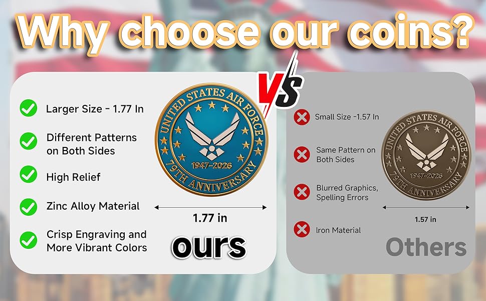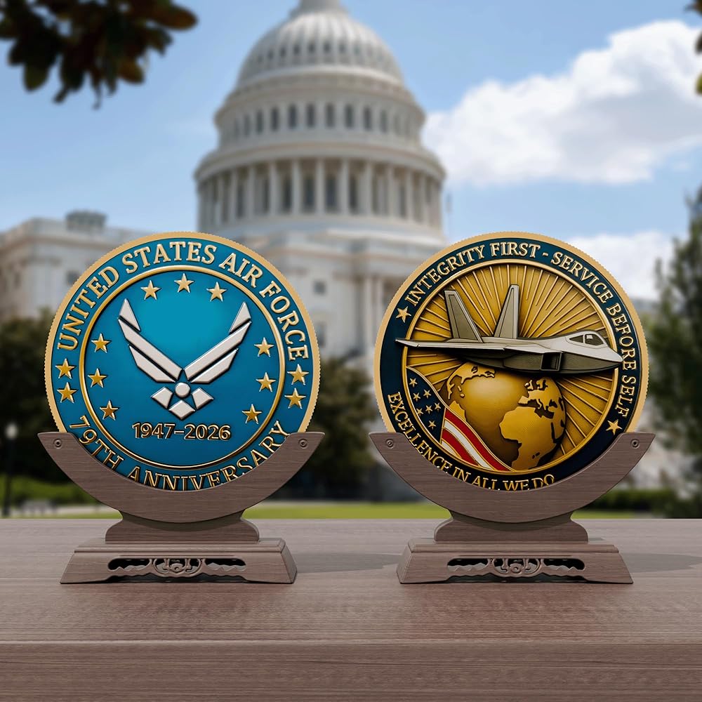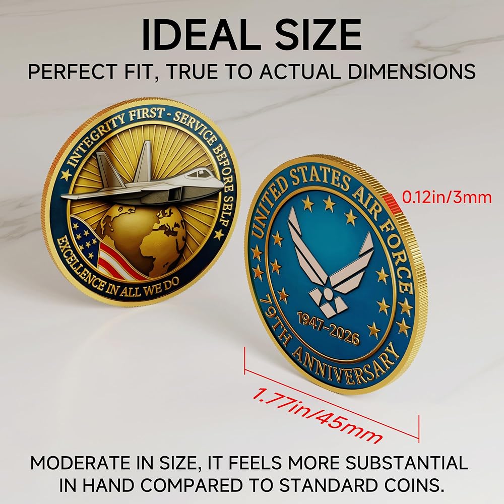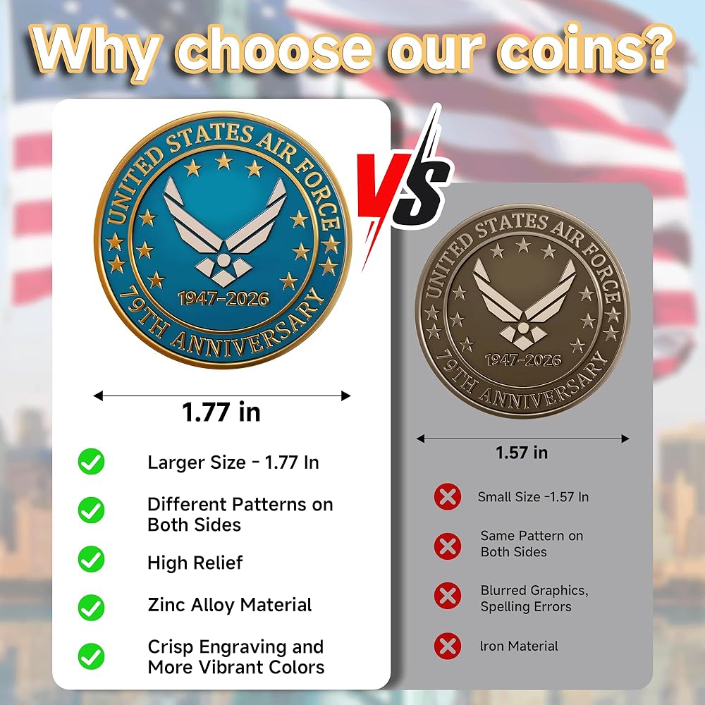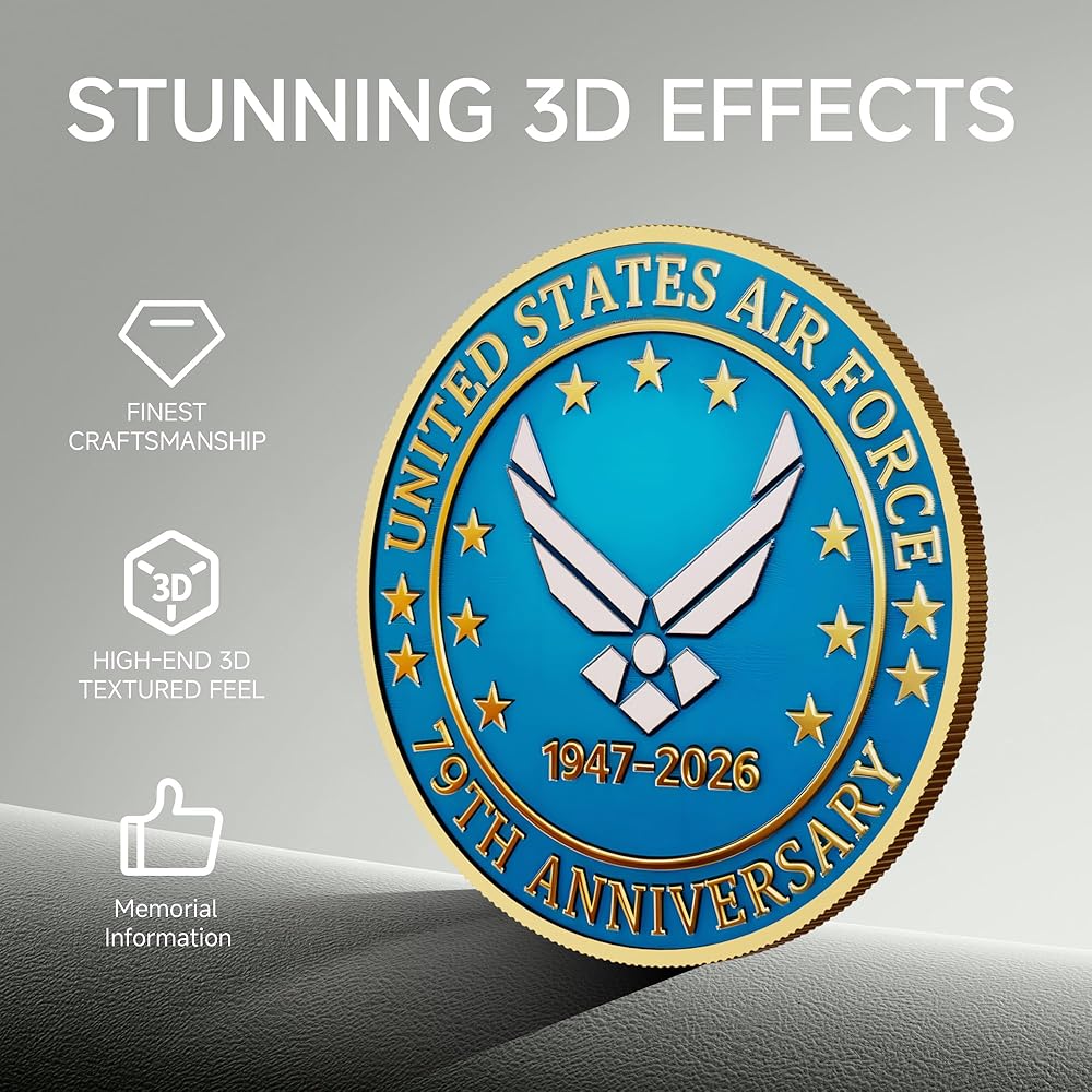 تصميم مفصل على الوجهين يتميز الجانب الأمامي بشعار القوات الجوية الرسمي مع نقش "79th Anniversary"؛ الجانب العكسي يعرض الولايات المتحدة الأمريكية. العلم والطائرات والقيم الأساسية - النزاهة أولاً، الخدمة قبل الذات، التميز في كل ما نقوم به.
