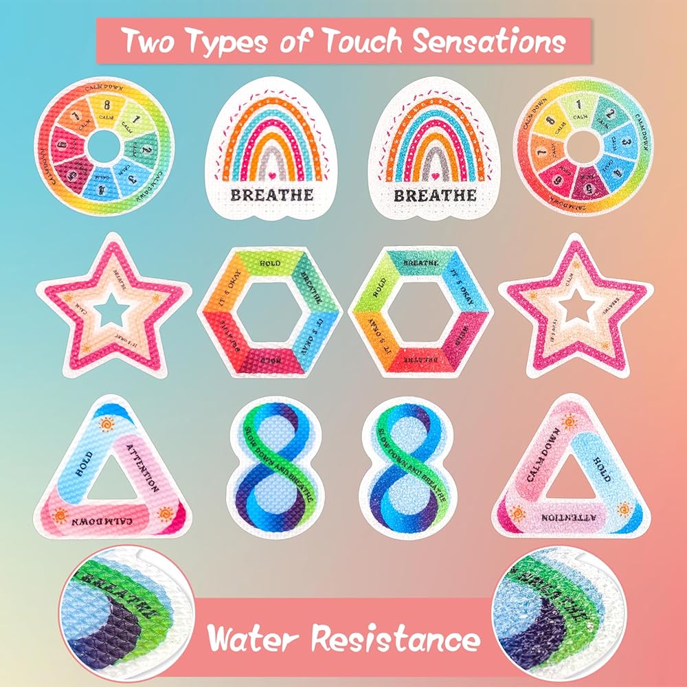 6 تصميمات أنماط لطيفة: تتضمن 6 أنواع مختلفة من الشرائط الحسية للقلق. إنها أكثر إثارة للاهتمام من الشرائط الحسية المستطيلة التي يمكن للأصابع فقط أن تنزلق لأعلى ولأسفل. يحتوي كل ملصق مزخرف على نص هادئ لمساعدتك على التخلص من التوتر بشكل أفضل