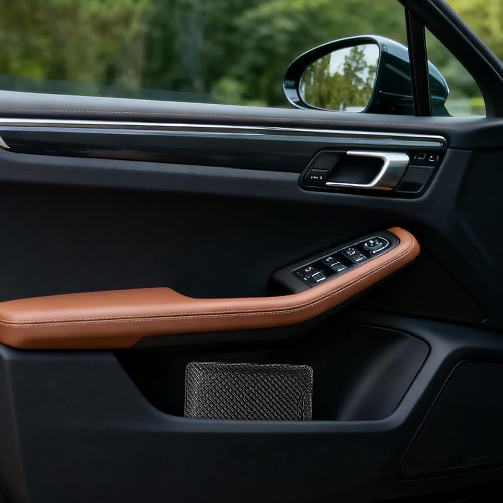 🔘 تصميم خارجي أنيق من ألياف الكربون يتميز حامل تسجيل وتأمين السيارة المتميز هذا بسطح متطور من ألياف الكربون يقاوم بصمات الأصابع بينما يمنح منظم صندوق القفازات ترقية عالية التقنية. يضمن التصميم المتين للغاية حماية طويلة الأمد لأساسيات تسجيل سيارتك وحامل بطاقة التأمين