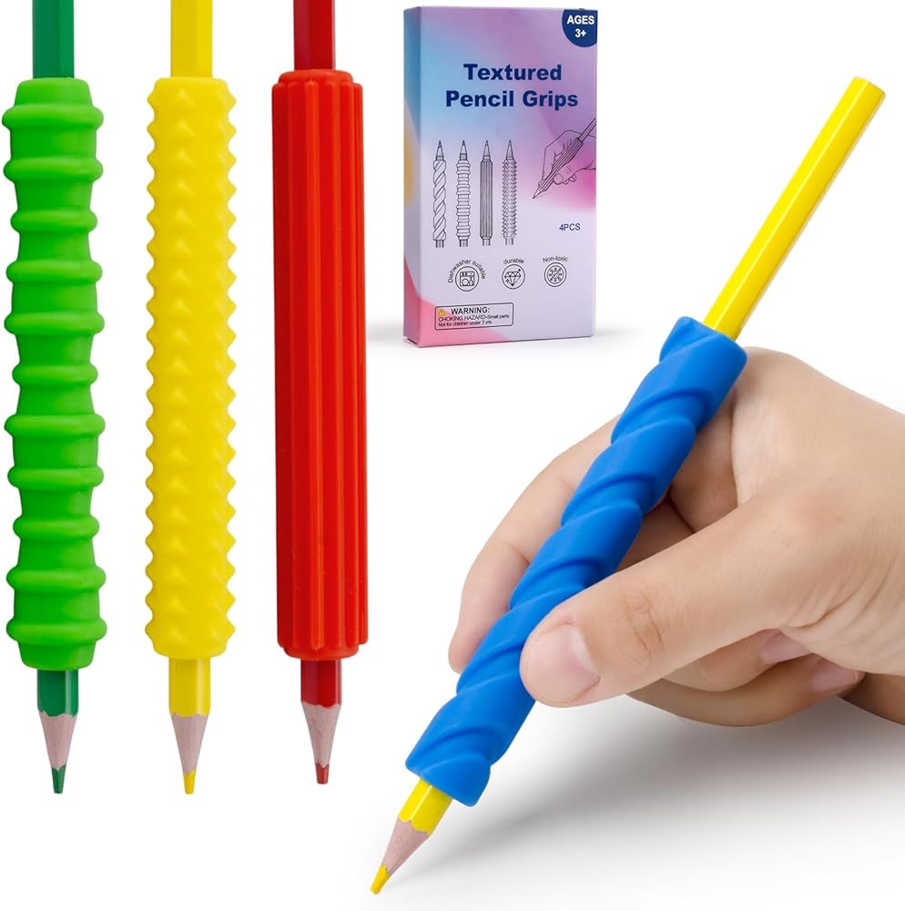 مقابض أقلام الرصاص للكتابة اليدوية: تساعد مادة السيليكون الناعمة والمرنة على تقليل التعب الناتج عن جلسات الكتابة الطويلة. يتم ربط المقابض بشكل آمن بالأقلام القياسية ولن تنزلق. تشتمل كل مجموعة على أربعة ألوان قوس قزح للتفاعل البصري وإثارة الاهتمام، بينما تقدم أيضًا أربعة أنسجة مختلفة. يساعد هذا المزيج على التركيز، ويقلل من القلق، ويعزز التنظيم العاطفي من خلال المدخلات البصرية واللمسية