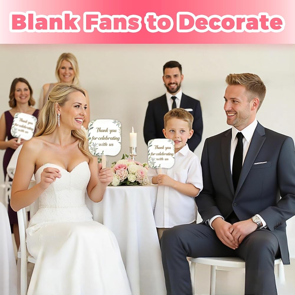 مجموعة محمولة من 154 قطعة من مراوح الكنيسة، 50 مروحة فارغة للتزيين، مراوح من الورق المقوى على عصا، مراوح مجداف ورقية، مجموعة مراوح لحفلات الزفاف والتخرج، مراوح ورقية مخصصة بعصي مموجة وشريط (6.5 × 7.25 بوصة)