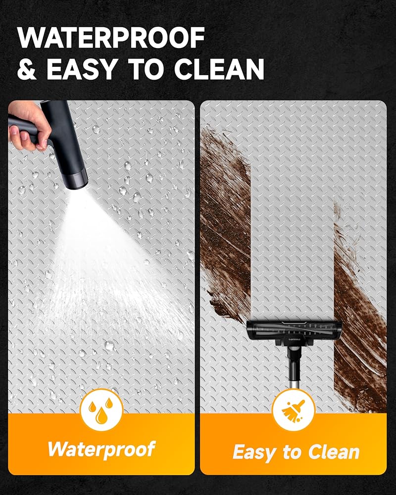 【مقاومة للماء وسهلة التنظيف】حافظ على أرضياتك نظيفة. يخلق السطح المقاوم للماء بنسبة 100% حاجزًا محكمًا ضد الزيوت والطين والسوائل المنسكبة الضارة. الصيانة بسيطة: فقط امسحها أو قم بخرطومها.