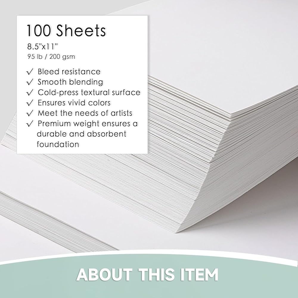 مجموعة ورق ألوان مائية من VEOOK، ورق ألوان مائية مقاس 8.5 بوصة × 11 بوصة، 100 ورقة 95 رطل/200 جرامًا للمتر المربع ورق رسم رسم فني للبالغين، الطلاء، دفتر الرسم، المجلة، اللوازم الفنية (WC-04)