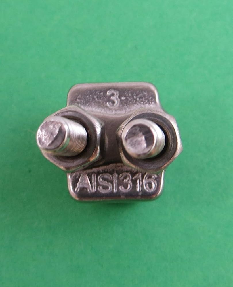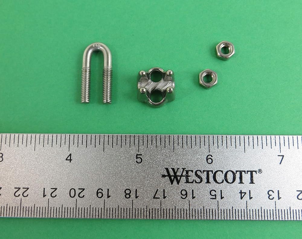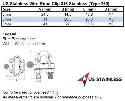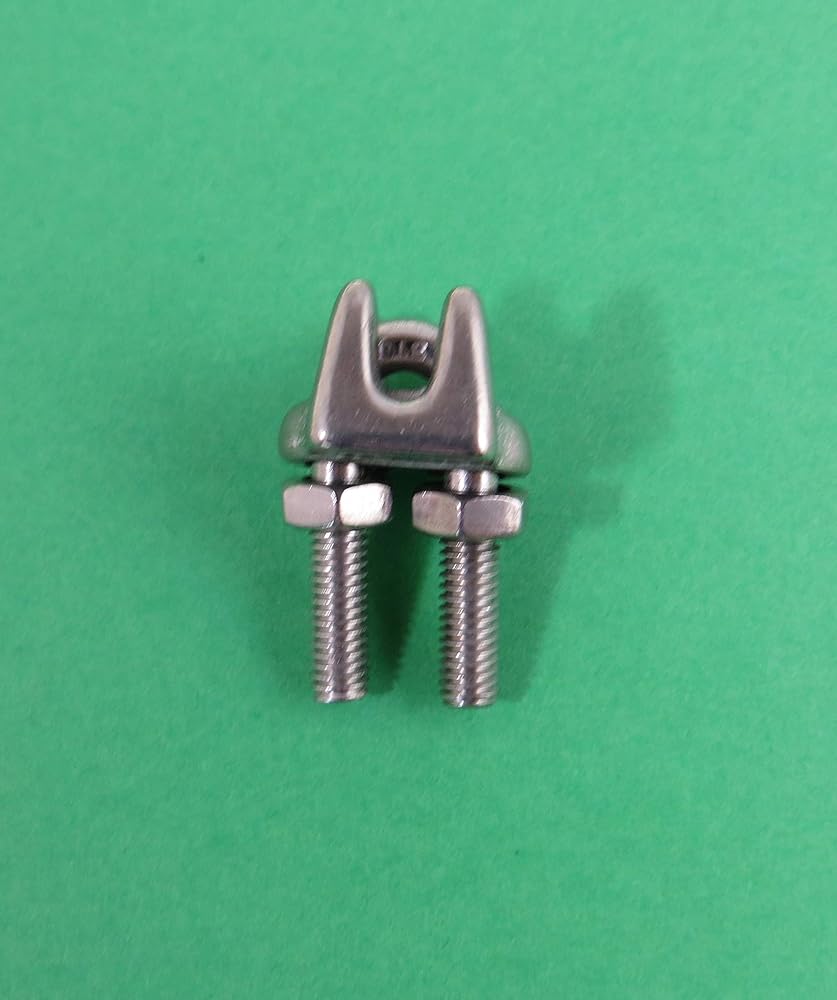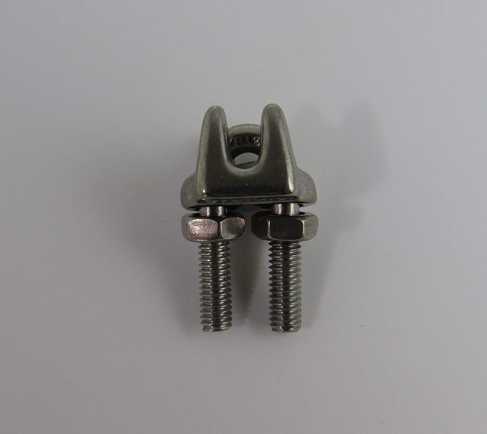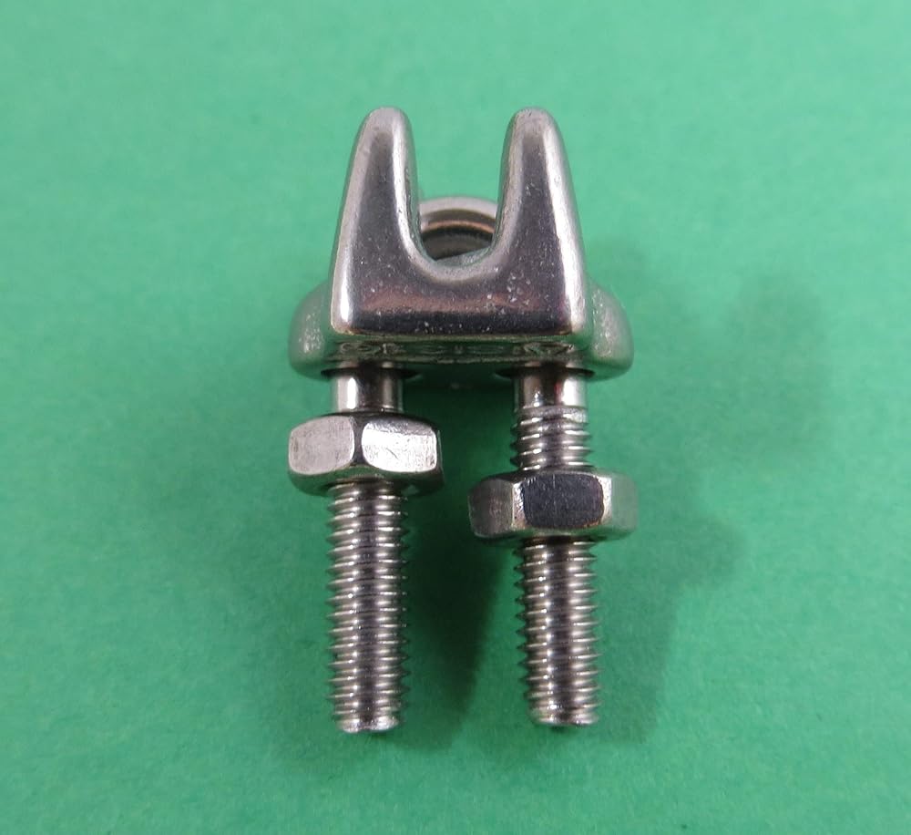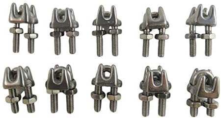 هذا لـ 10 (10) مشابك حبل من الفولاذ المقاوم للصدأ من الدرجة البحرية (AISI 316). مناسب لسلك 1/8 بوصة أو 3 مم. لا يمكن استخدامها للرفع العلوي. الفولاذ المقاوم للصدأ AISI 316 هو درجة فاخرة من الفولاذ المقاوم للصدأ ويعتبر الكثيرون الأفضل في فئته. 316 مقاوم للتآكل ومتين للغاية حتى في أقسى الظروف. يتكون المشبك من برغي على شكل حرف U وسرج وصمولة للبرغي على شكل حرف U. مصممة للجمع بين طولين من الحبل السلكي أو لتشكيل عين أو حلقة على السلك.