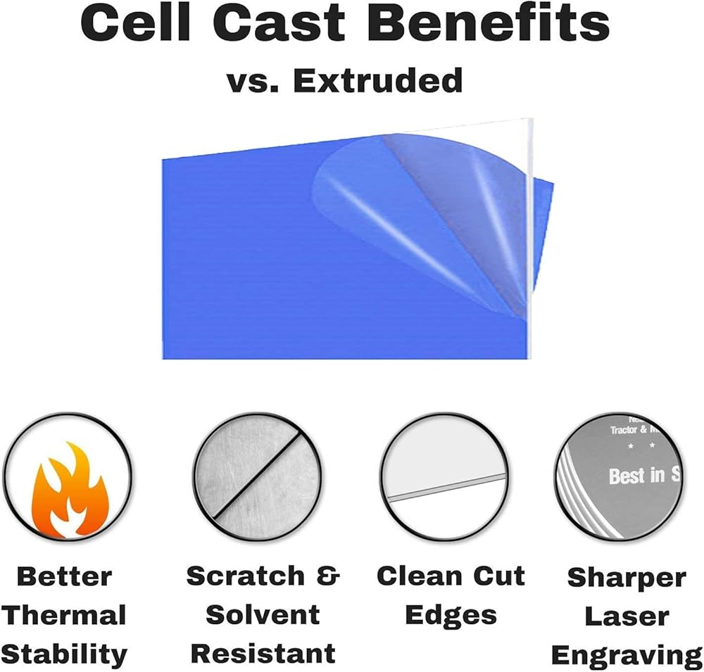 لوح زجاج شبكي من الأكريليك المصبوب مقاس 24 × 24 أقوى وأقوى بحوالي 8 مرات من الزجاج، كما أنه خفيف الوزن وسهل التشكيل أو التصنيع والقطع، مع عدم وجود نقطة انصهار، حيث يتم قطع ألواح الأكريليك السميكة باستخدام الليزر، أو المنشار، أو المنشار، أو المثقاب، أو جهاز التوجيه، أو المنشار الحزامي سريع وسهل. يوفر الإصدار المصبوب الخلوي حواف مقطوعة نظيفة بدون نتوءات ونقش ليزر أكثر وضوحًا ومقاومة أعلى للخدش والمذيبات الكيميائية.