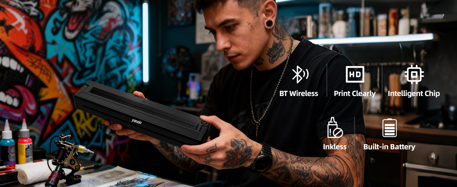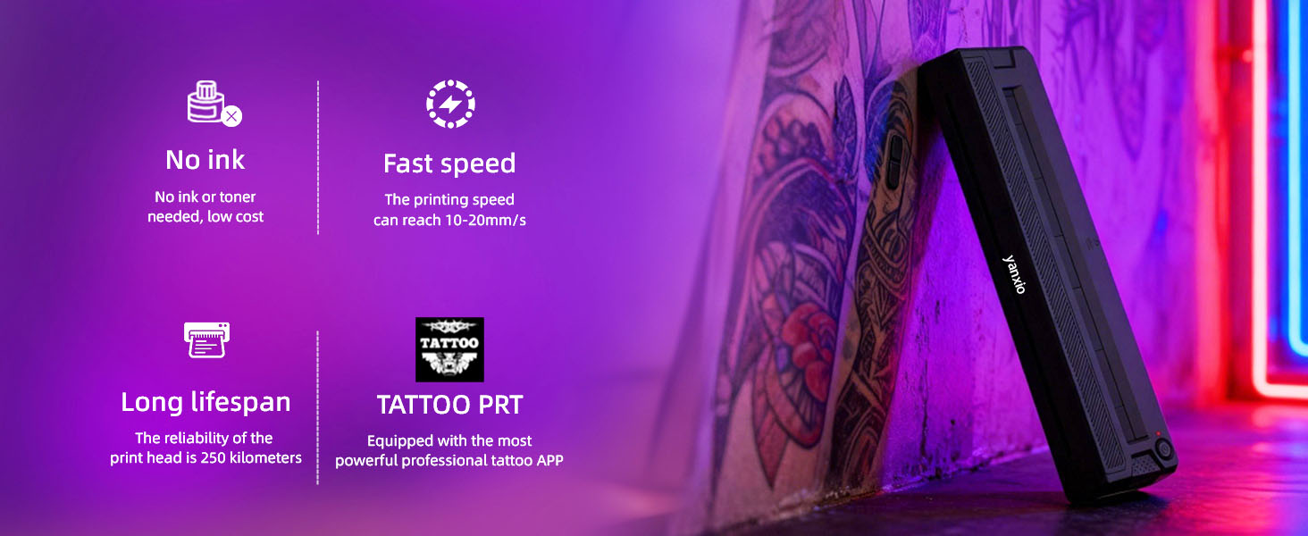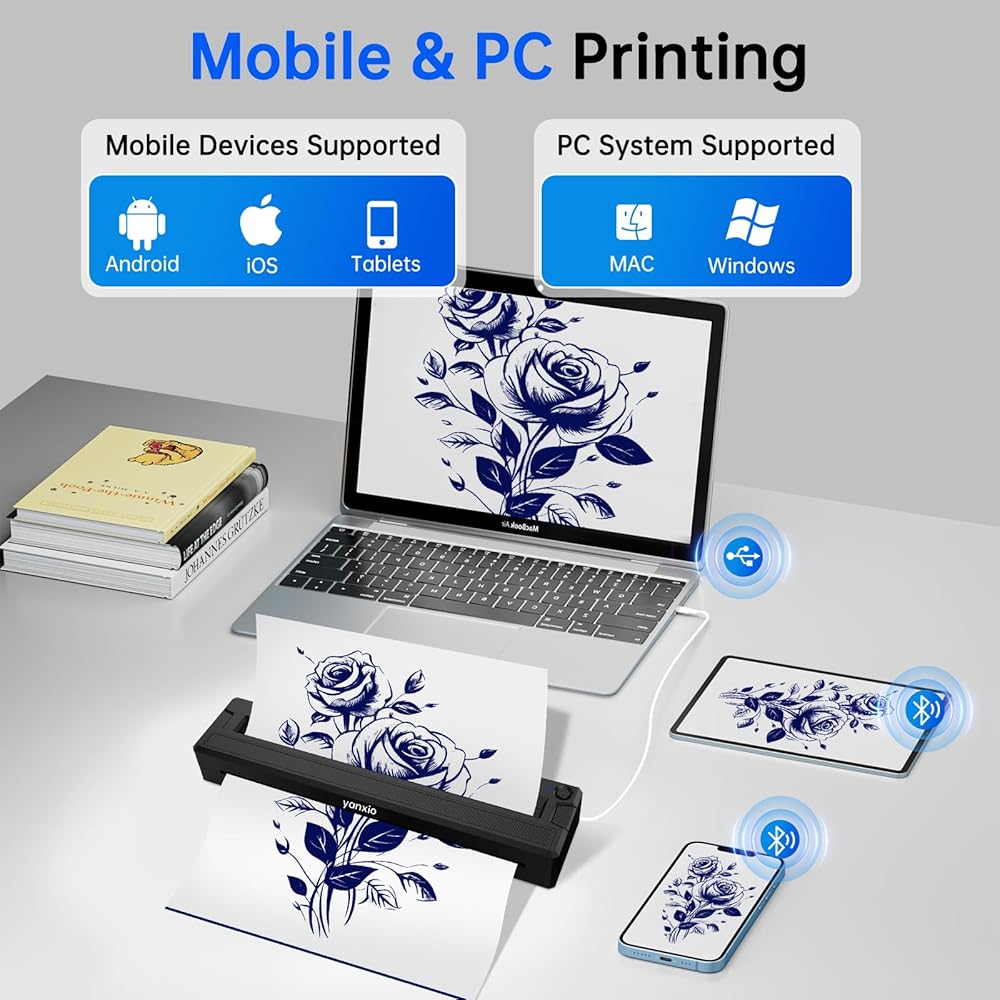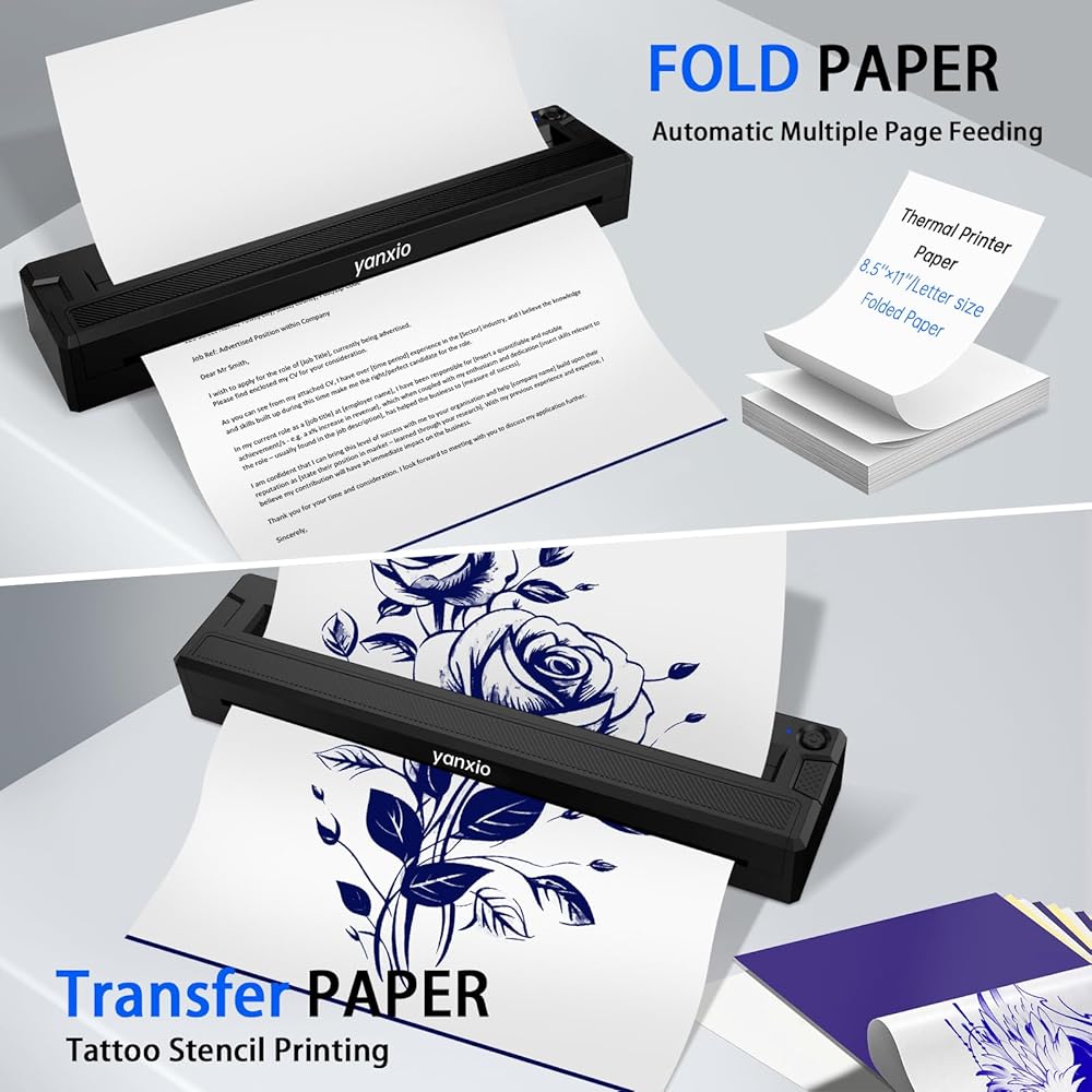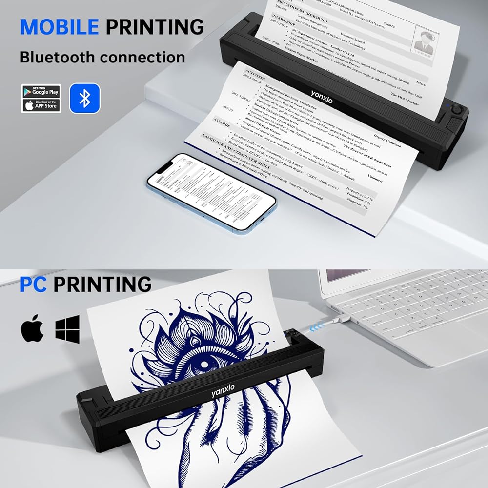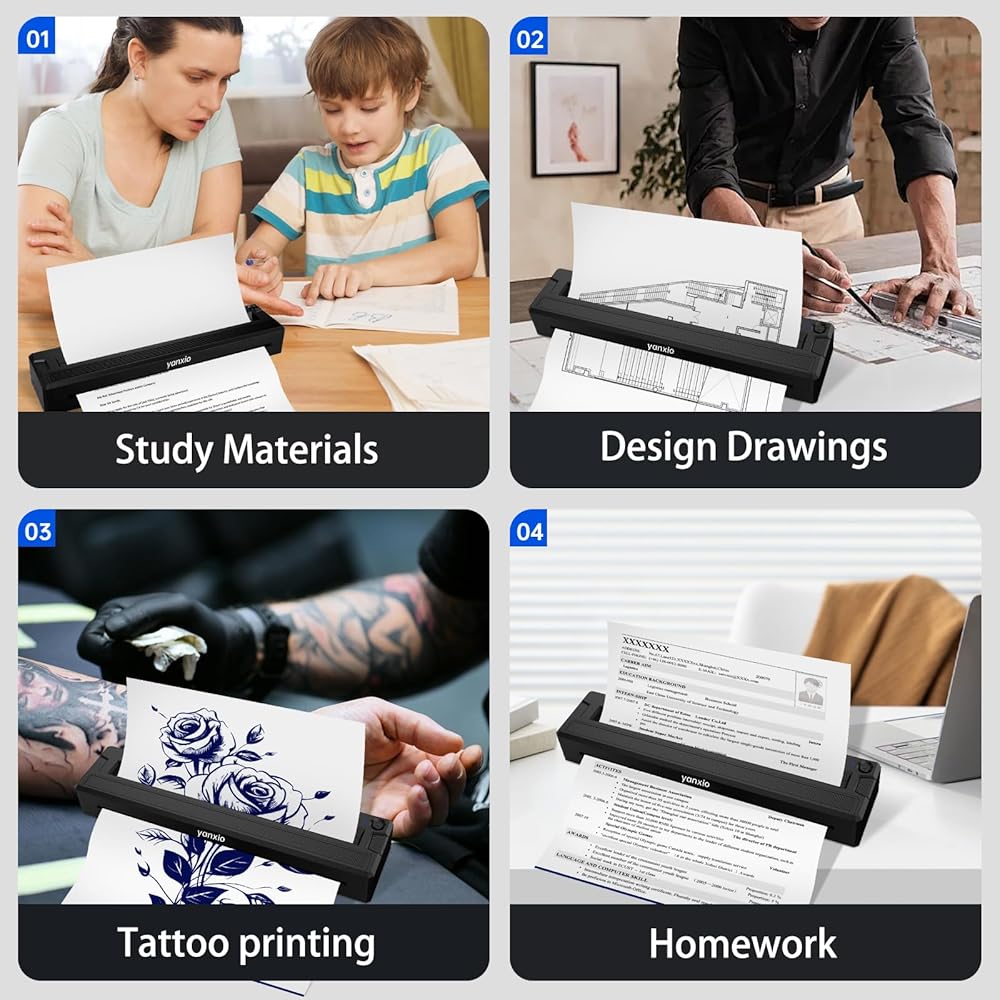 الطابعة الحرارية المحمولة: إنها قابلة للتطبيق لكل من طباعة استنسل الوشم لفناني الوشم وطباعة المستندات اليومية للاستخدام الرسمي والمنزلي والمدرسة وداخل السيارة. ويغطي معظم سيناريوهات الطباعة للجميع. إنها طابعة متعددة الاستخدامات وخالية من الحبر تقوم بطباعة المستندات والملصقات والملاحظات والإيصالات على ورق حراري قياسي. إنها مثالية للمحترفين المتنقلين والطلاب والاستخدام المنزلي للطباعة السريعة أثناء التنقل