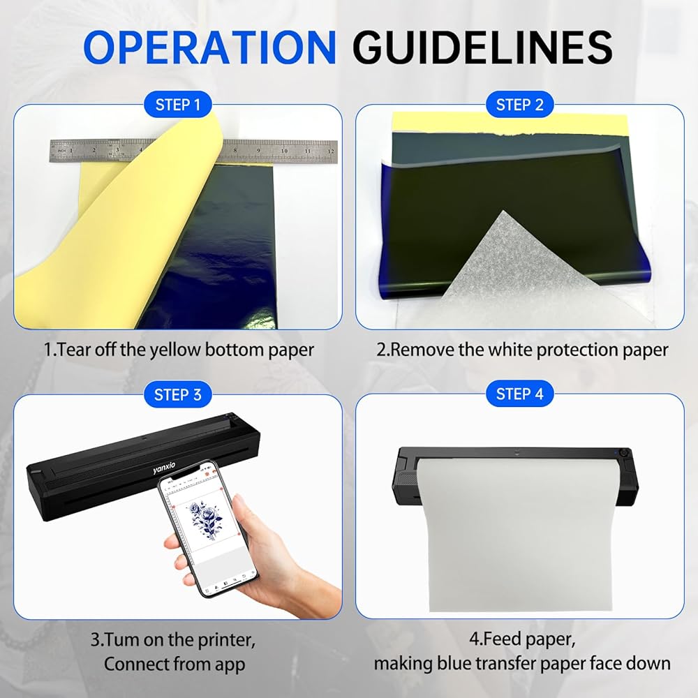 قم بتبسيط سير عملك من خلال تطبيق الهاتف المحمول البديهي الخاص بنا: تقترن الطابعة الحرارية التي تعمل بتقنية Bluetooth مع تطبيق بسيط وقوي مصمم لفناني الوشم. قم بتنزيله في ثوانٍ واستمتع بتجربة طباعة سلسة. يمكنك الوصول إلى مكتبة مدمجة لقوالب الوشم للإلهام، أو تحميل تصميماتك المخصصة بسهولة من معرض الصور الخاص بك أو برنامج الرسم. بفضل عناصر التحكم البديهية لتغيير حجم أعمالك الفنية ومرآتها وتحسينها، يمكنك طباعة استنسل مثالي لاسلكيًا في أقل من دقيقة