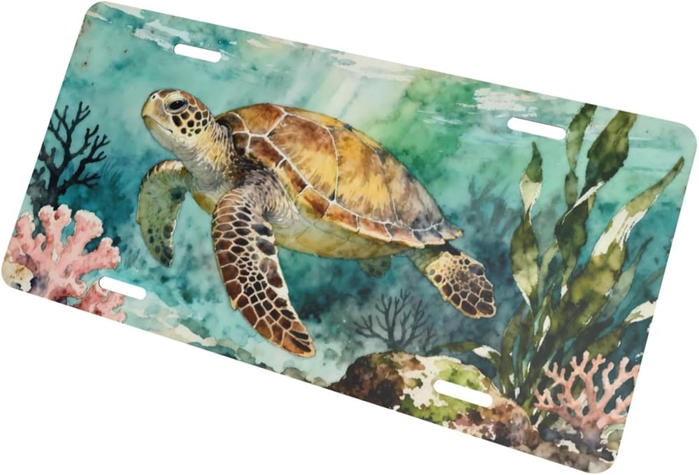 Sea Turtle Coral Seaweed Seabed Front License Plate Car Decorative License Plates Aluminum Metal Decor Accessory Novelty Vanity Tag Cover with 4 Holes for Men Women 6" X 12"