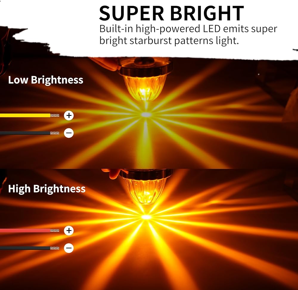 【Easy 3-Wire Installation & Versatile Function】 Features a simple 3-wire setup (Black: Ground/Negative, Yellow: Low-Brightness for marker lights, Red: High-Brightness for turn signals) for quick plug-and-play installation. Universal wiring allows for flexible use as side markers, turn signals, or auxiliary lighting on various vehicle parts.