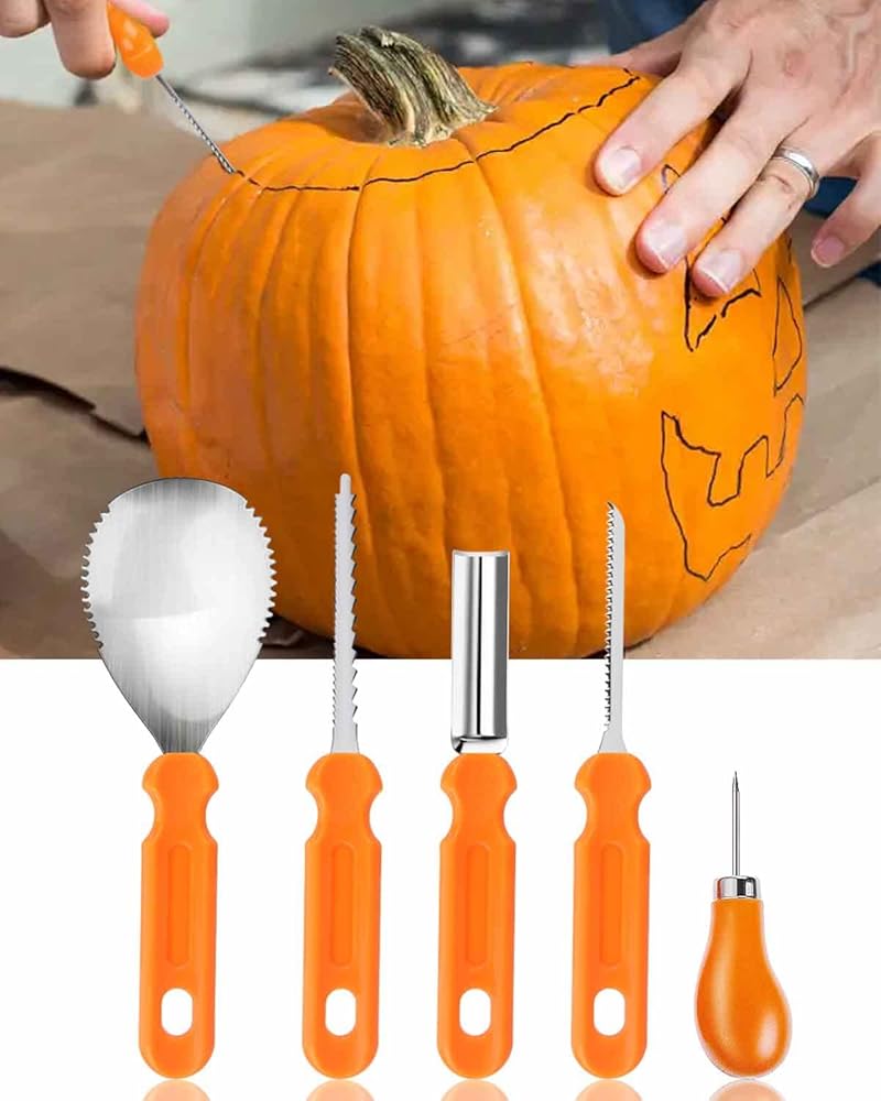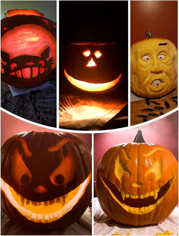 وصف المنتج: يجمع بين مزيج فريد من نوعه من القيمة الرائعة والمتانة والدقة الحرفية الاحترافية. الآن يمكن لأي شخص الاستمتاع بنحت اليقطين أسرع بكثير وأسهل وأنظف. اجعل الحياة التعبيرية مثل تصميمات شخصيات اليقطين باستخدام الأدوات لقص وخلق تفاصيل حقيقية ثلاثية الأبعاد مثل الشعر والأسنان والأنف والعينين.