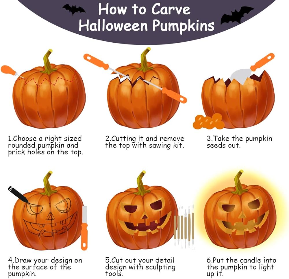 • احصل على المزيد من المرح لنحت الفانوس الخاص بك. باستخدام جميع الأدوات لقص اليقطين ونحت جميع تفاصيل الوجه مثل الأسنان والعينين والأنف.