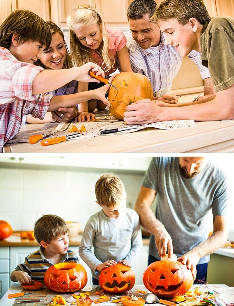 • 11 مجموعة احترافية لنحت اليقطين مع 6 أدوات للنحت والتقطيع والقص، و5 أدوات للنحت بما في ذلك أداتي مجرفة قرع حادين ومنشاري أسنان قويين و1 لكمة دائرية.